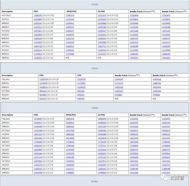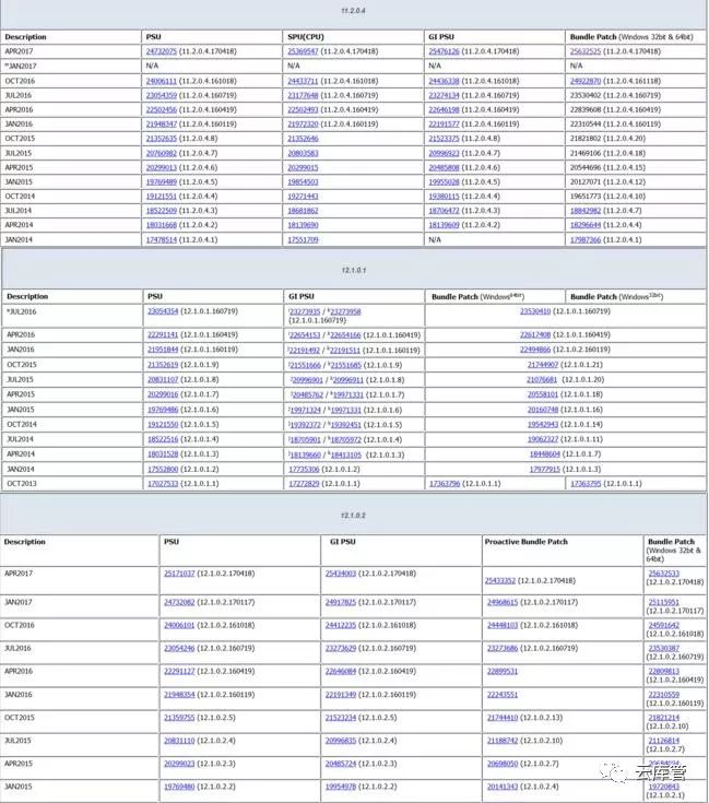 Patch Set Update (PSU):每 季度发布一次,修复比较严重的一些问题,包含每季的CPU,是累积型的。虽然在描述PSU的时候会用到数据库版本第5位,比如Database PSU 11.2.0.3.5,但实际上打完PSU后并不会真正改变数据库的版本,从v$version中看到的版本还是4位的(11.2.0.3.0),第5位 仍然是0。注意,Windows上没有CPU和PSU,Oracle的集群软件和数据库软件使用不同的PSU。