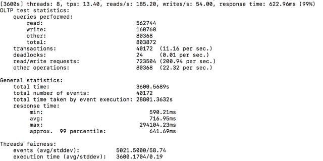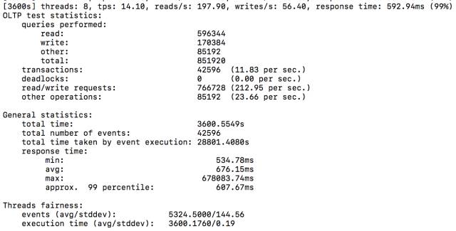性能测试参数./sysbench --test=tests/db/oltp.lua --oltp_tables_count=10 --oltp-table-size=10000000 --num-threads=8 --oltp-read-only=off --report-interval=10 --rand-type=uniform --max-time=3600 --max-requests=0 --percentile=99 run 上述命令表明我们开8个并发连接,同时进行读写测试,每10秒输出一次结果