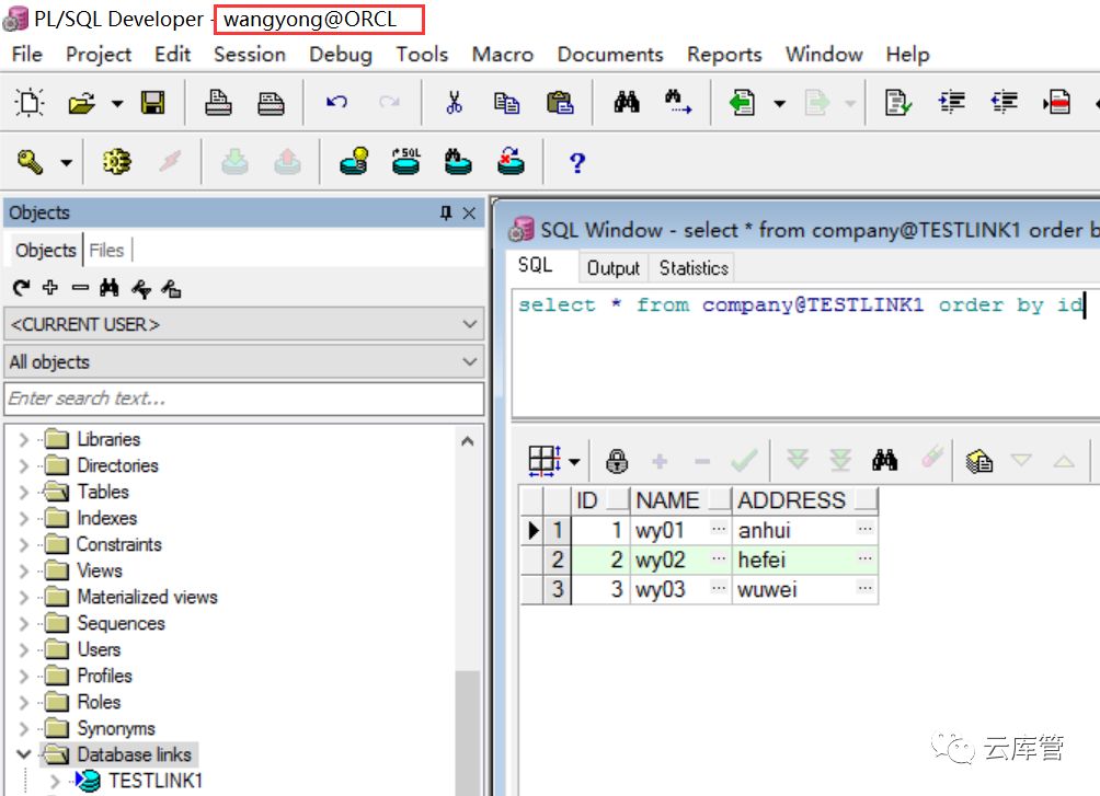 从截图中可以看到,在ORCL中可以成功访问到ORCL2中用户WANGYONG的表