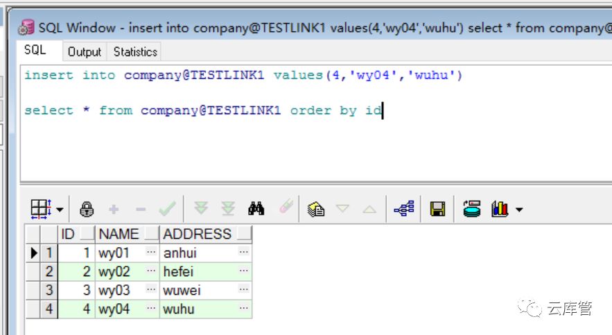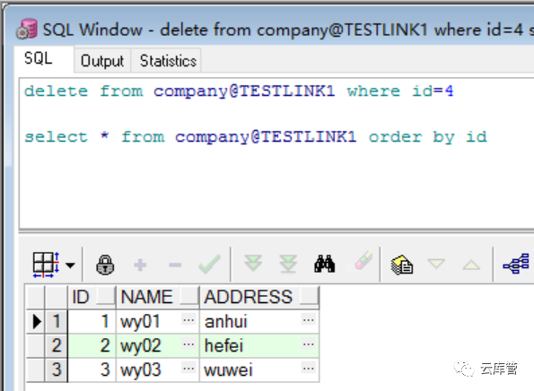 那么上面的查询、插入、修改、删除中可直接用WYSYNONYM代替company@TESTLINK1即可,例如查询语句可改成如下方式(插入,修改,删除类似):