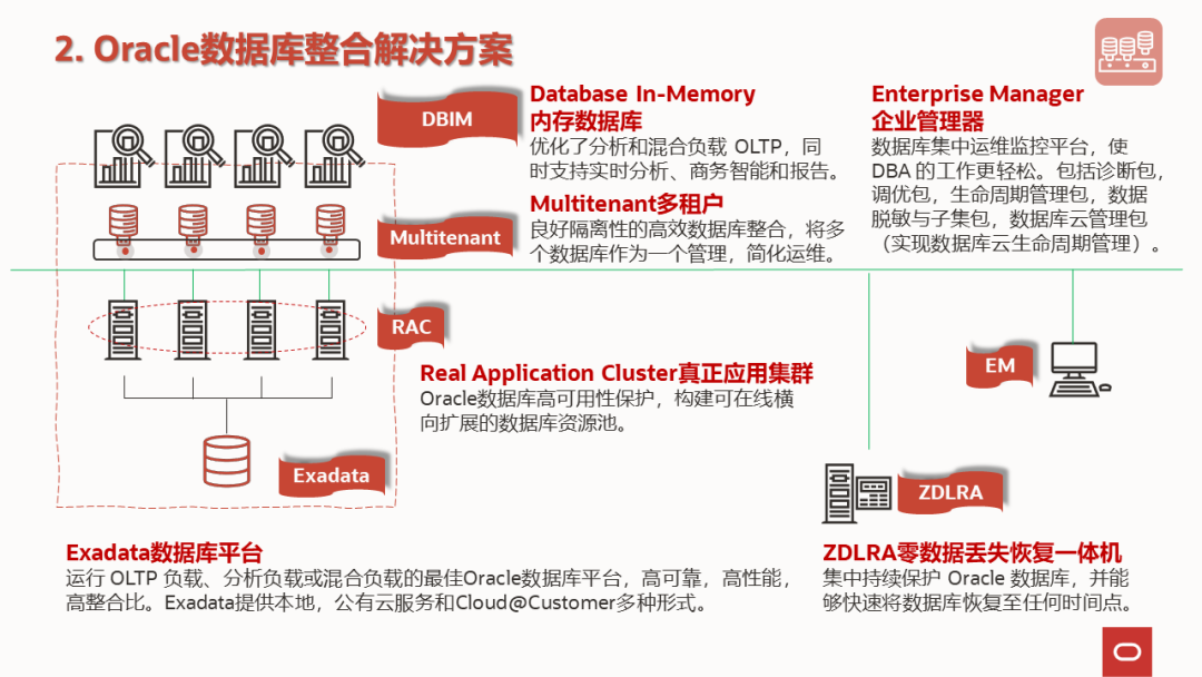 数据库整合除了以上三大技术支柱外,ZDLRA可实现数据库备份的整合,Oracle的融合数据库特性可实现非结构化数据,JSON,Spatial和Graph等多数据类型的整合。Database In-Memory数据库选件可实现极限分析工作负载的整合。