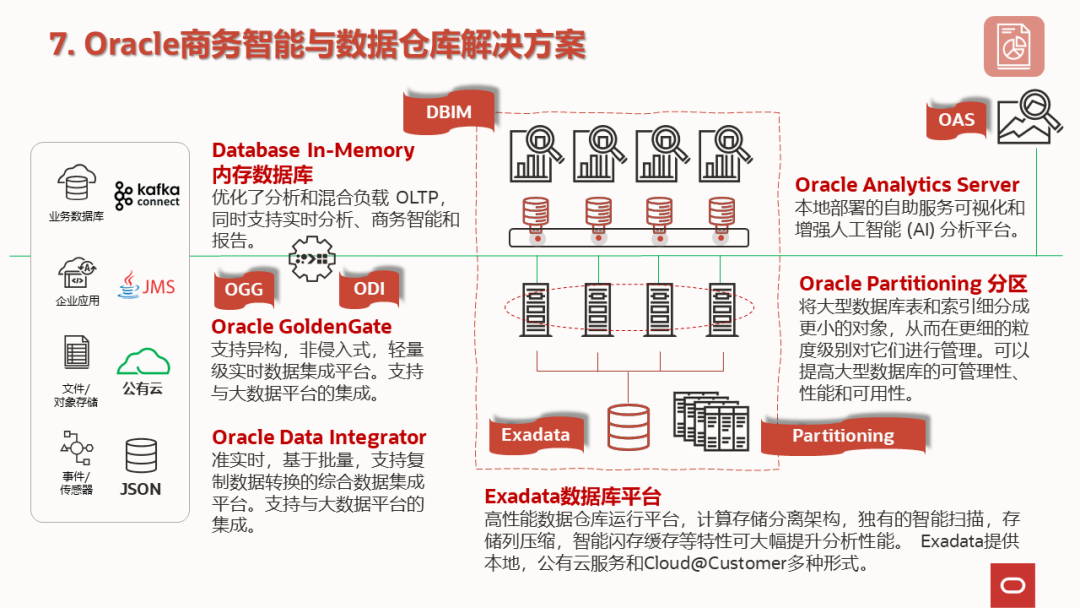 BIDW方案中,数据源支持结构化的关系型数据库,也支持半结构化和非结构化的JSON,文本,图形图像等。集成方式包括属于CDC(变化数据捕获)支持实时集成的Oracle GoldenGate以及属于ELT的Oracle Data Integrator。Oracle GoldenGate的特点包括实时非侵入式数据集成,以及对于异构的支持,包括不同的数据库产品,相同数据库不同的版本,不同的硬件平台,不同的操作系统。Oracle Data Integrator也称为ODI,ODI的特点是支持丰富的转换转换,以及提供丰富的知识模块,从而简化集成任务,免除或减少用户端代码开发。另外需要强调的一点是,ODI和OGG都支持大数据体系,特别是OGG与Kafka的集成,在用户处得到了广泛采用。
