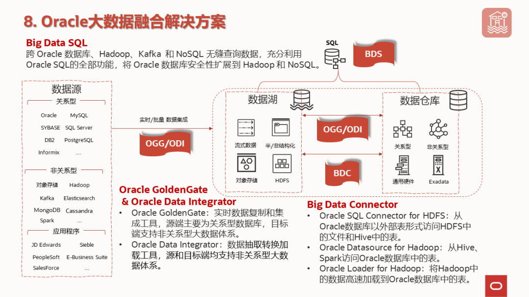 Oracle和大数据的关系,可以从数据库内外两个层面来看。从内部来说,Oracle数据库本身就是融合数据库,可以支持非结构化或半结构化类型数据的处理,如文本,图形图像,JSON等。从外部来看,开源大数据体系已相对成熟,Oracle也没必要重新搞一遍。因此Oracle除了自己有一个NoSQL数据库外,其余就将重点放在了和大数据体系的融合上面。在此基础上,可以衍生出湖仓一体,数据平台,数据中台,数据底座之类的解决方案。