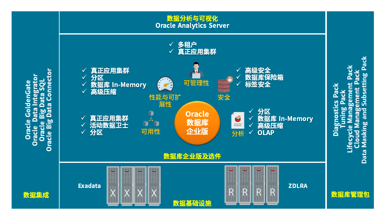 通过这9个解决方案,相信您已经对Oracle的核心数据能力有了基本的了解。实际上,这些解决方案是通过Oracle数据库企业版及选件,数据库管理包,工程化数据基础设施,数据集成和数据分析等产品组合而成。特别是Oracle数据库企业版选件和数据库管理包中包含了丰富的选项,在之前的文章"王宝器漫游O记数据商店"中已经做过详细介绍。