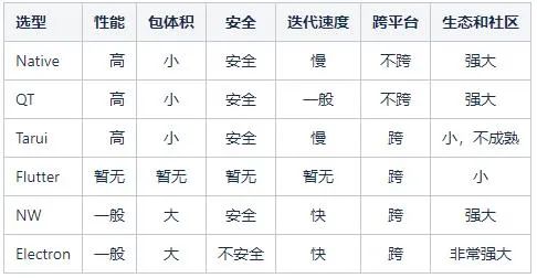 在团队中,我们因业务发展,需要用到桌面端技术,如离线可用、调用桌面系统能力。什么是桌面端开发?一句话概括就是:以 Windows 、macOS 和 Linux 为操作系统的软件开发。对此我们做了详细的技术调研,桌面端的开发方式主要有 Native 、 QT 、 Flutter 、 NW 、 Electron 、 Tarui 。其各自优劣势如下表格所示: