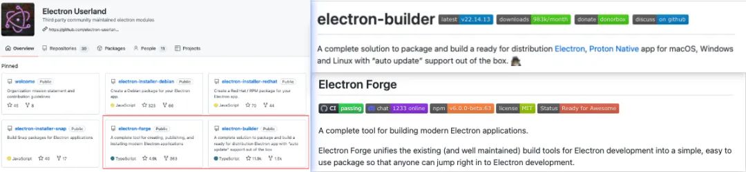 这里提一下 electron-builder 其和 electron-forge 的介绍和区别,看下图所示: