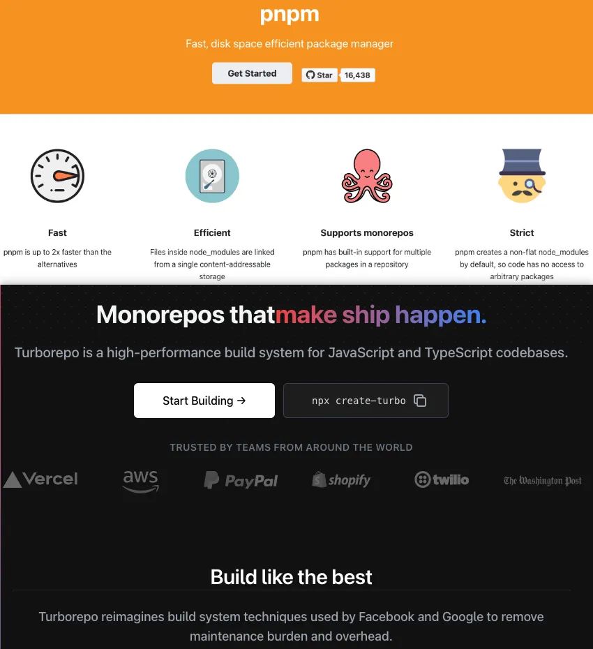 如 pnpm 擅长依赖管理, turbo 擅长构建任务编排。遂在 monorepo 技术选型上,我选择了 pnpm 和 turbo 。