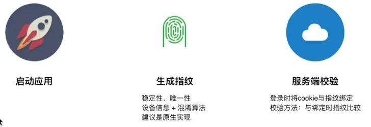 目前熟知的一个安全问题是克隆攻击,此问题的主流解决方案是将用户认证信息和应用设备指纹进行绑定,整体流程如如下图所示: