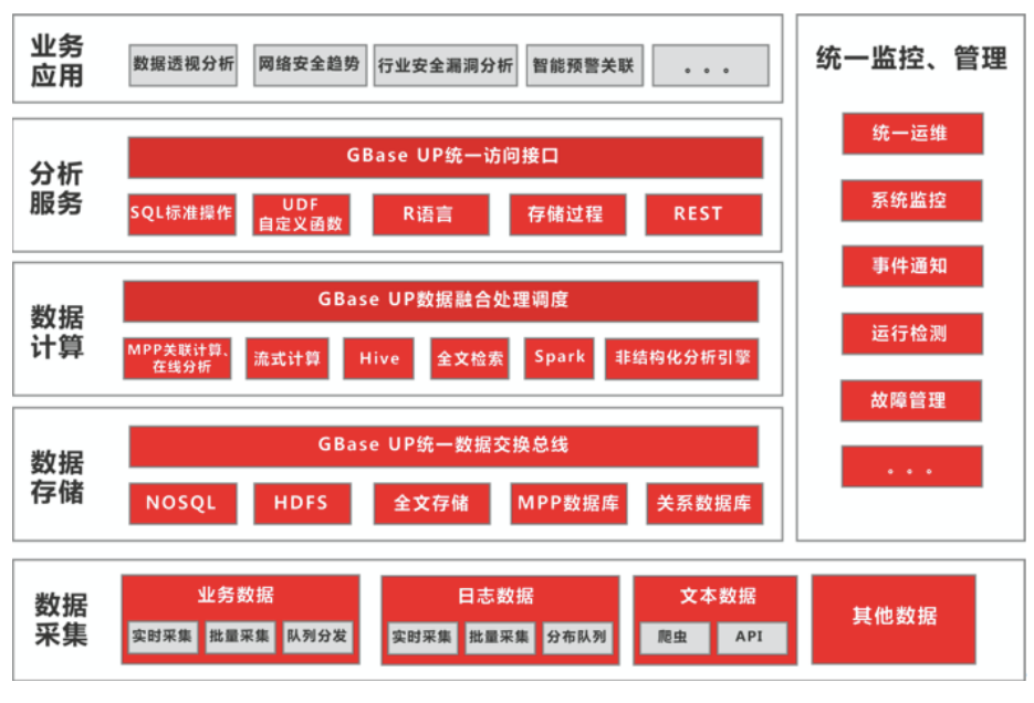 基于GBase UP融合架构构建DaaS平台:构建的大数据平台兼具OLTP的稳定高效的事务数据库、OLAP大规模分布式并行MPP数据库集群、NoSQL等多种大规模结构化、半结构化与非结构化数据处理技术,构建了对外统一,对内可扩展的大数据平台,支撑结构化数据、非结构化、半结构化数据的采集、存储与计算应用,能够适应OLAP、OLTP和NOSQL三种计算模型的业务场景。