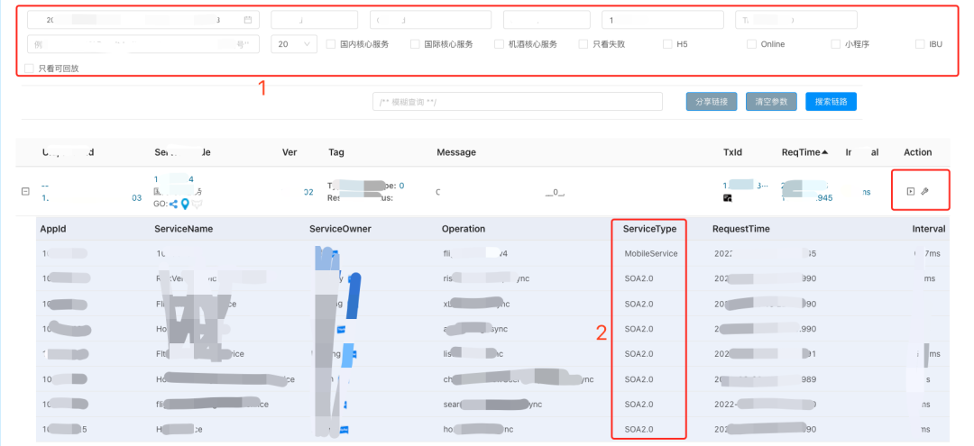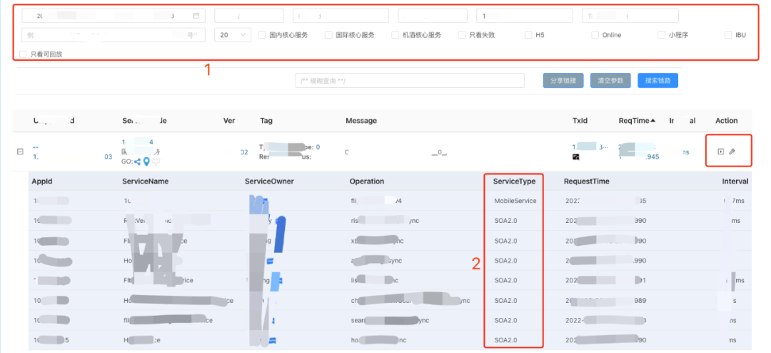 针对Kibana的搜索条件进行了降噪和业务封装,采用了更适合用户行为习惯的友好搜索条件,见下图标志1。