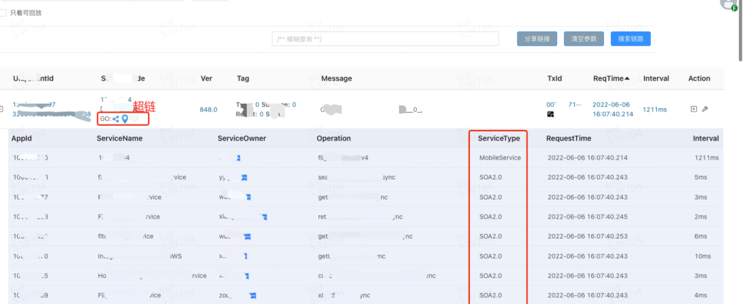 比如在分析服务日志的同时需要查询用户的UI访问日志,需要在两个平台间跳转,并且平台的搜索数据无法同步。为了解决该问题,Trace系统采用了外链的形式进行聚合并关联单次查询的搜索数据,如时间和用户标志等,进行多平台之间的传递,从而达到数据串联的效果。