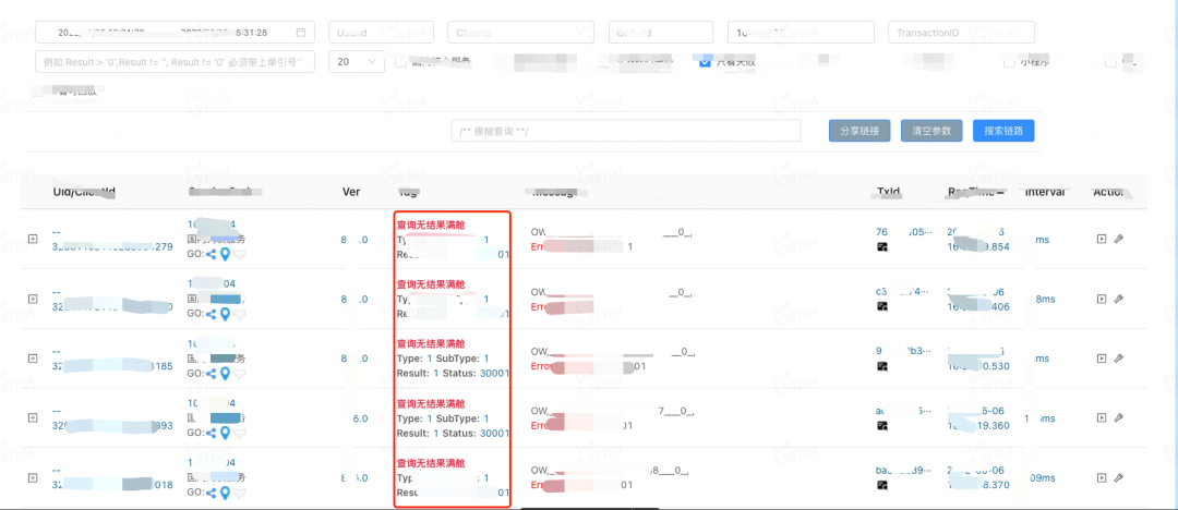 报表系统是前台用于日常业务的监控系统,它能实时监控异常的业务场景和业务处理结果。Trace系统联通报表系统,在报表系统中可以通过外链跳转至Trace系统,并传递异常场景的相关参数,如用户标志,场景限定等,从而获取异常场景的上下文(日志),见4.7示图。