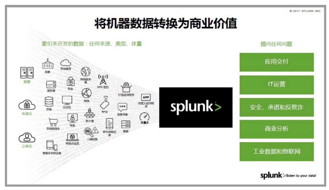 在生态建造的行业布局上,目前Splunk通过核心产品+定制化解决方案的产品体系,涉及五类细分领域:IT运营、应用管理、安全合规、商业分析、物联网及工业大数据。