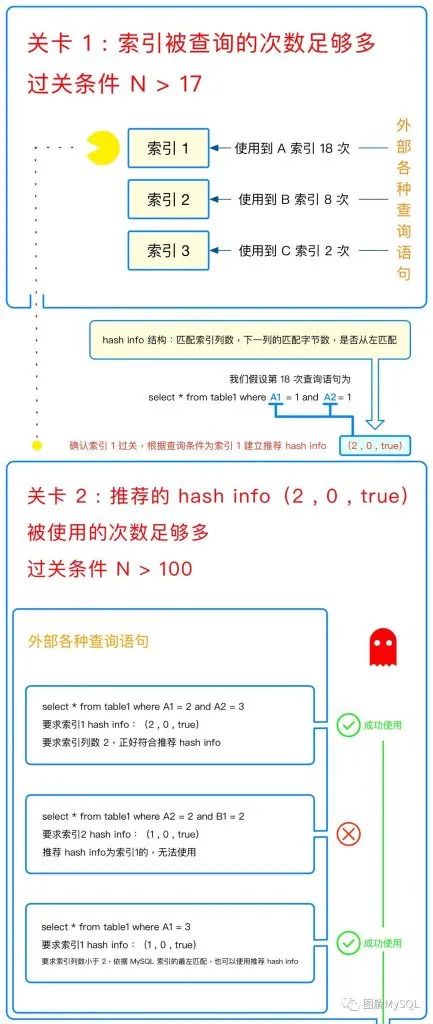 本文主要讨论 MySQL 是如何建立起一个"刚刚好"的 AHI 的,如图 1 所示:需要经历三个关卡,才能为某个数据页建立 AHI,之后的查询才能使用到该 AHI。