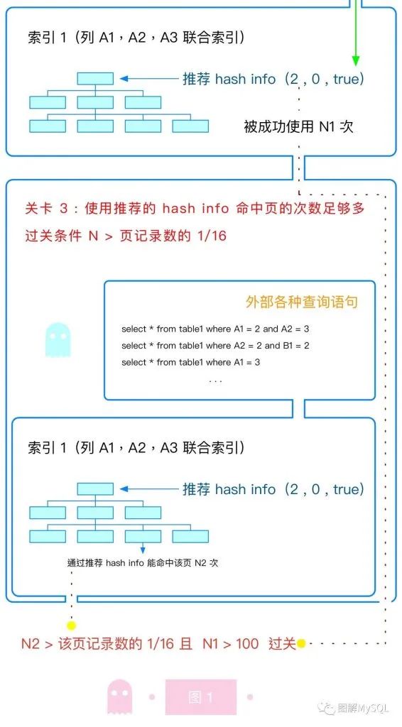 表 table1 具有 4 列:A1,A2,A3,B1。具有两个索引 Idx1(A1,A2,A3) 和 Idx2(B1) 关卡 1:选出的索引是 Idx1 关卡 2:选出的 hash info 是 (2, 0, true) (很多查询命中了 Idx1 的最左两列) 关卡 3:选出了某个数据页 P3,其中包含数据 (1,1,1,1) 和 (1,2,2,2) 等等
