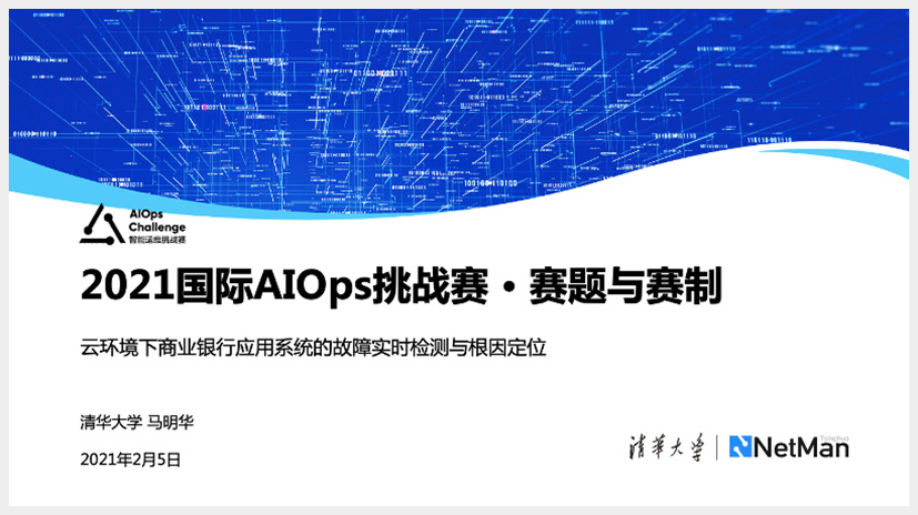 会上,清华大学长聘副教授裴丹做了《AIOps前沿展望》主题演讲,分享了AIOps智能运维的定义:“任何模拟运维人员行为的计算机技术,可以基于专家知识、经验、自动化、机器学习、深度学习,或它们的某种组合,并践行‘知识+数据+算法+算力’的AI 3.0 理念。”同时,裴丹教授勾勒出运维排障AIOps的思路和落地路线图,并号召通过持续不断的社区努力,在监控数据、算法、自动化、知识积累等方面共创AIOps生态系统,不断落地AIOps智能运维的价值,降低故障修复时间,提升系统无故障周期。随后,清华大学马明华博士解读了2021国际AIOps挑战赛的赛题和赛制。他指出,本届大赛以 “云环境下商业银行应用系统的故障实时检测与根因定位”为赛题,初衷在于应对基于多模态的运维数据和适用不同应用系统的挑战,并首次引入银行系统监控数据和日志数据,采用真实环境、真实流量和真实数据,增强了大赛的挑战难度和精彩程度。同时,对于参赛选手关注的赛程,马明华博士介绍大赛分为预赛、复赛和决赛三个阶段,大赛奖金池设为26万元,最高奖金为10万元,将于5月13日第一届国际互联网产业科技创新大会暨互联网创新产品展览会举办现场答辩和颁奖典礼,同期还将举办智能运维前沿论坛,邀业界专家学者共同针对AIOps领域的技术与热点话题进行研讨,分享AIOps领域的前沿成果。实践分享:两家大型商业银行分享运维实践,积极推进AIOps的落地应用