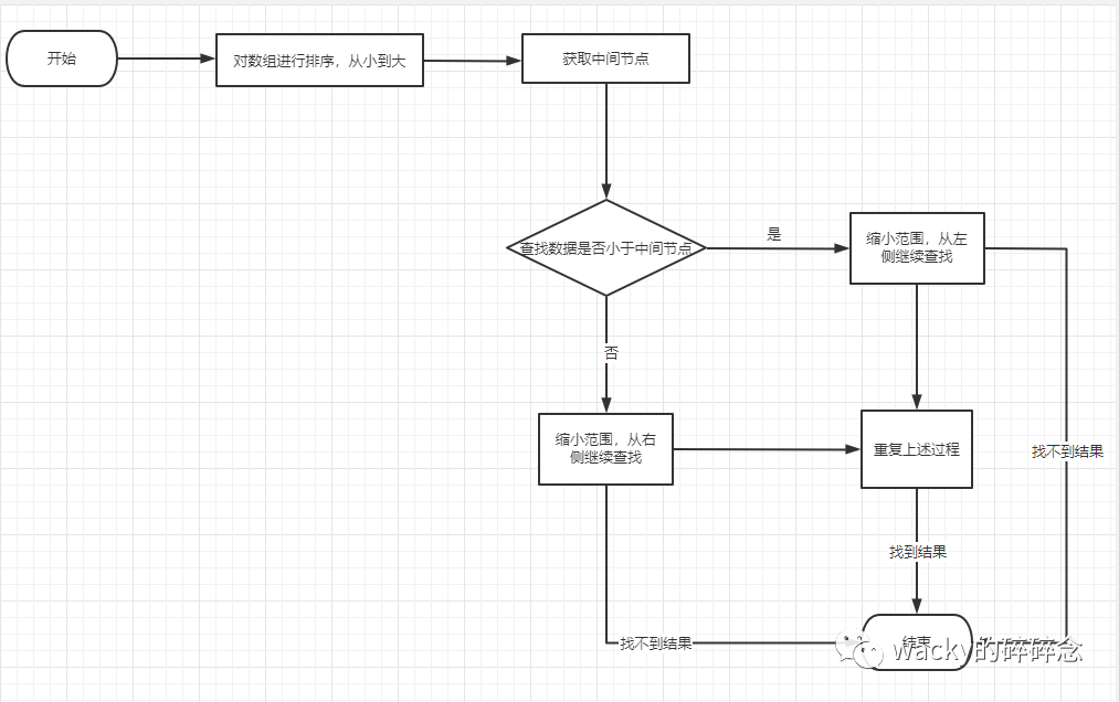 二分法是一种常用的查找算法,相较于逐个遍历查找而言,二分法的时间复杂度为O(log2n)。为了帮助大家理解和回忆二分查找,我画了一张二分查找的流程图: