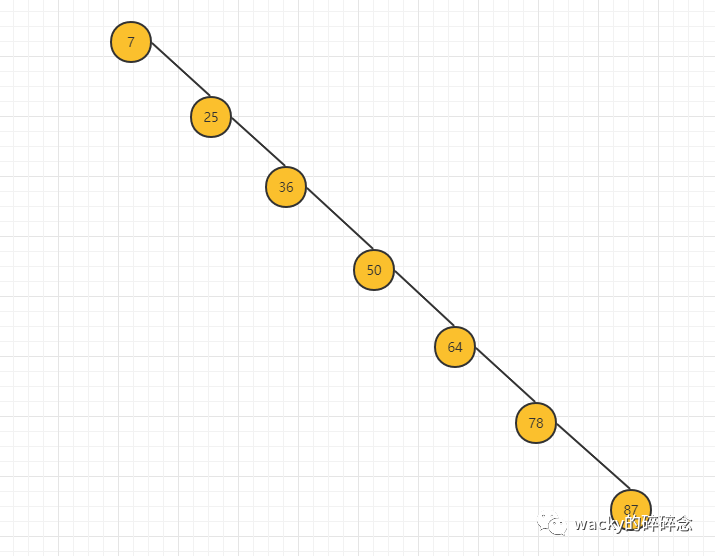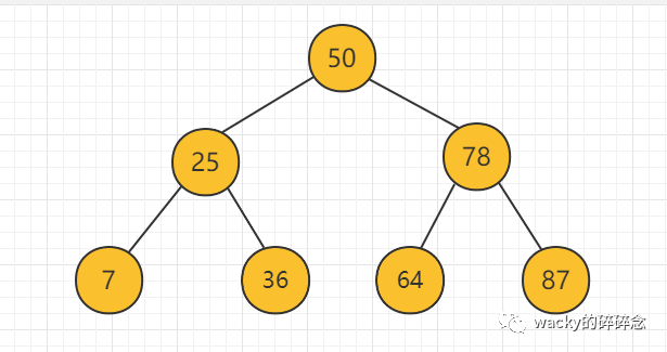 如上文所述,二叉搜索树的特征是有序,且预先把数据进行分段存储,并且将中间节点作为树的根节点,那么我们会得到如下的二叉树结构,这里以数组[7,25,36,50,64,78,87]为例,创建出来的二叉树如下所示: