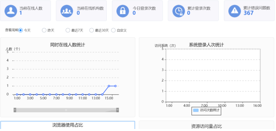 ①系统监控:提供系统概况统计,展示系统使用人数、登录次数、资源访问情况等。对系统资源占用情况,也提供监控页面,直观展示出 CPU 占用率、内存占用率、活动连接数,及耗时监控。