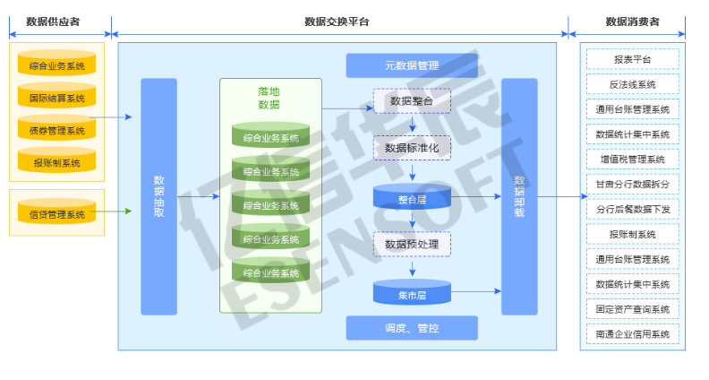 针对综合业务系统、信贷、国际结算等源业务系统的数据通过亿信数据交换平台进行统一抽取,通过数据转义、码值转换等实现数据标准化,并将处理后的数据以文件或库表等形式下发给消费系统。