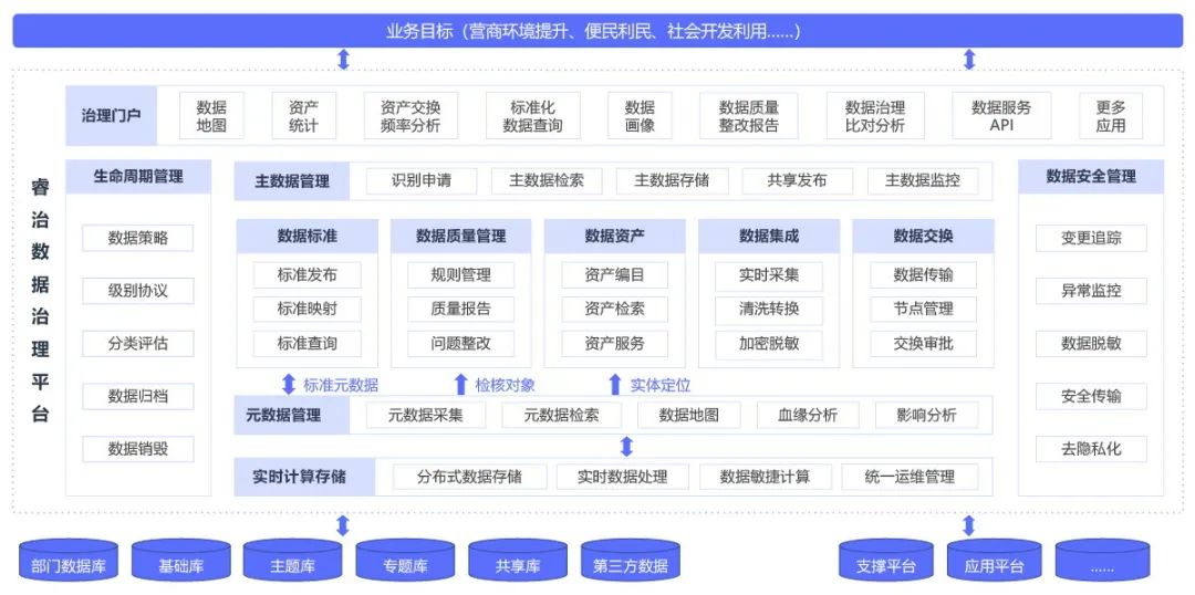 数据治理包括数据治理的工具和技术,总体应包括元数据管理、主数据管理、数据标准管理、数据质量管理和数据安全管理等。合理引入技术工具,能提升效率,节省人力成本。亿信华辰旗下睿治数据治理平台正是融合数据集成、数据交换、实时计算存储、元数据管理、数据标准管理、数据质量管理、主数据管理、数据资产管理、数据安全管理、数据生命周期管理十大产品模块,打通数据治理各个环节,十大产品模块可独立或灵活组合使用,快速满足政府、企业各类不同的数据治理场景。