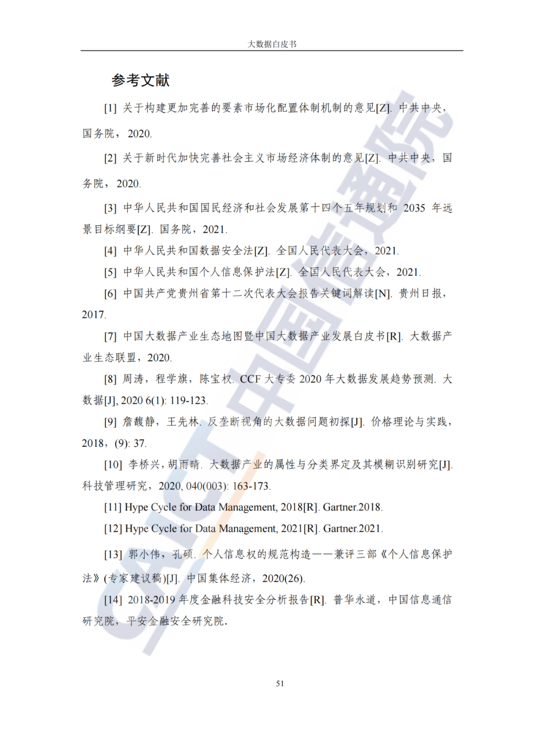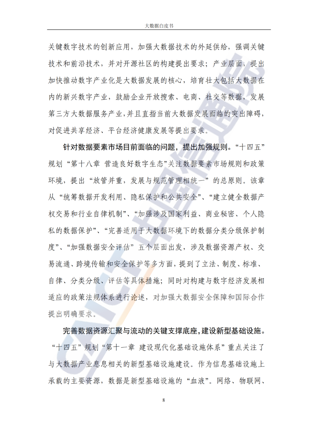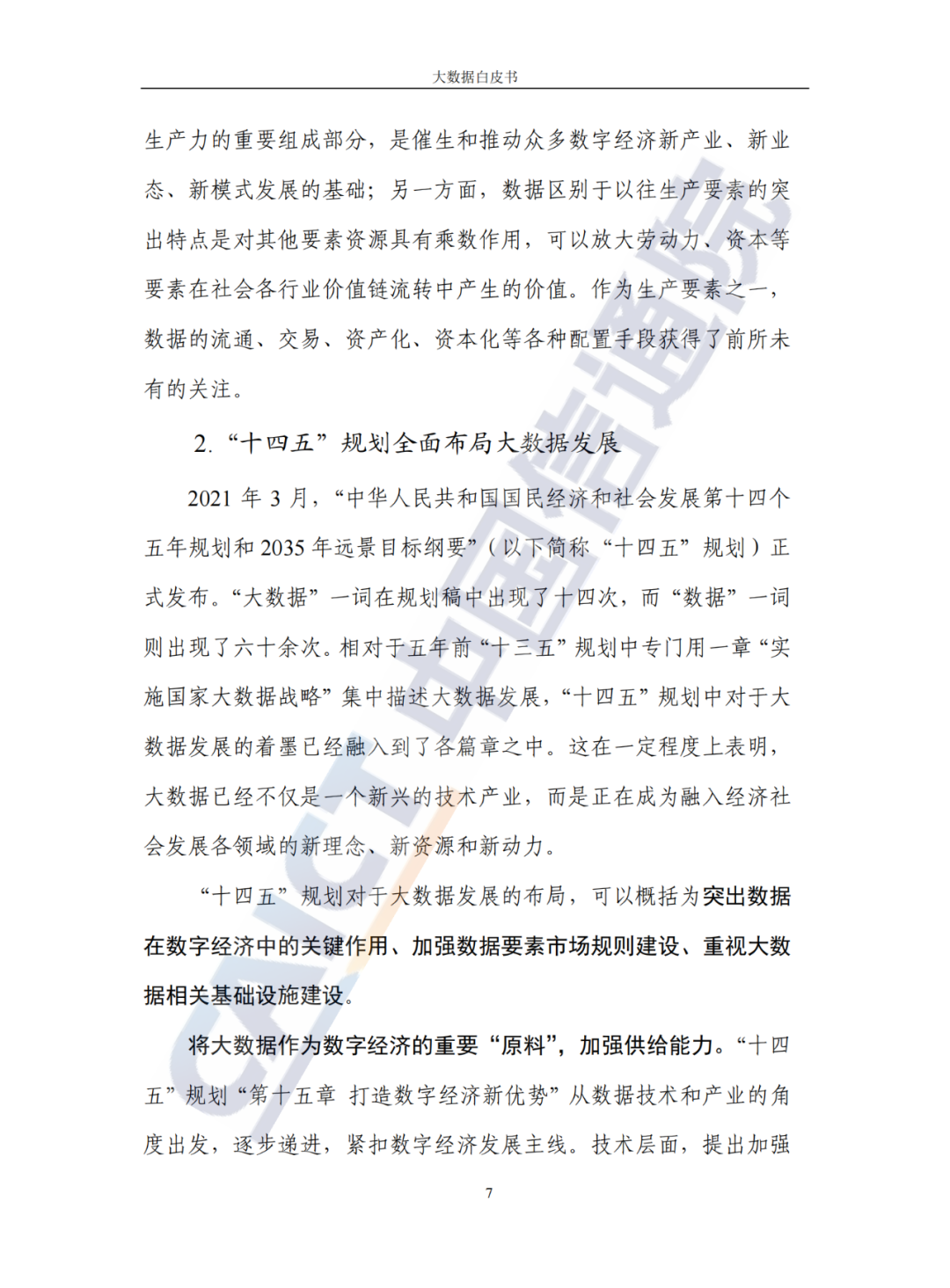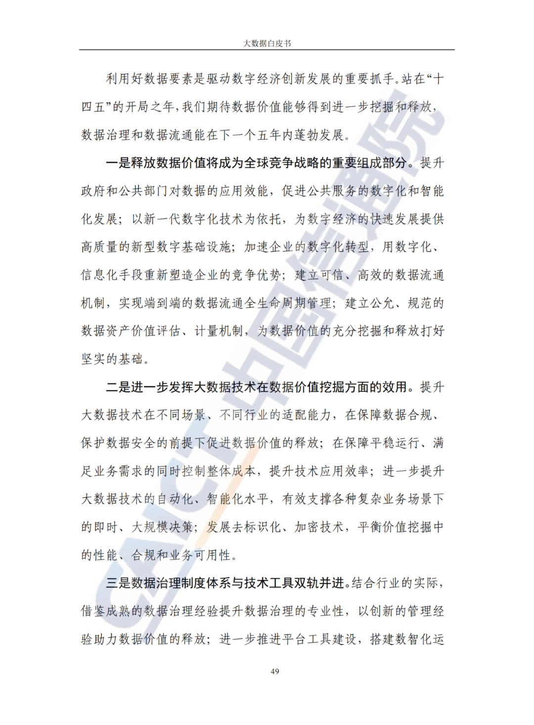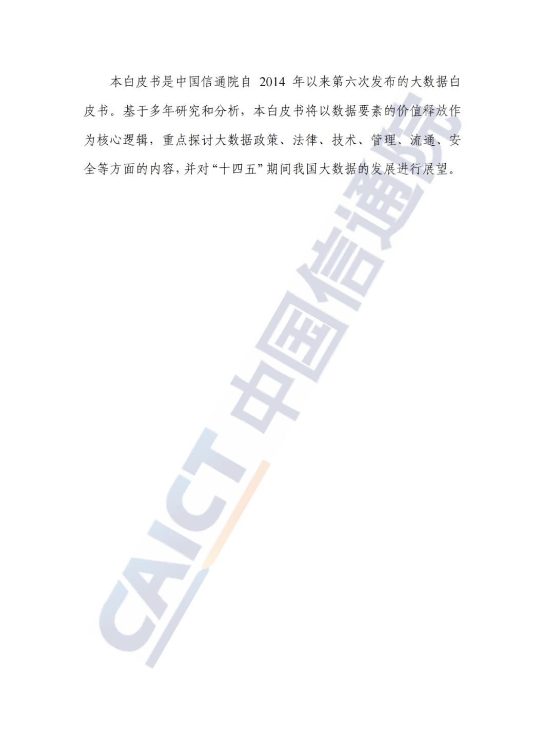 中国信息通信研究院发布的《大数据白皮书》以数据要素的价值释放作为可信逻辑,重点探索大数据政策、法律、技术、管理、流通、安全等方面的内容,并对“十四五”期间我国大数据的发展进行展望。