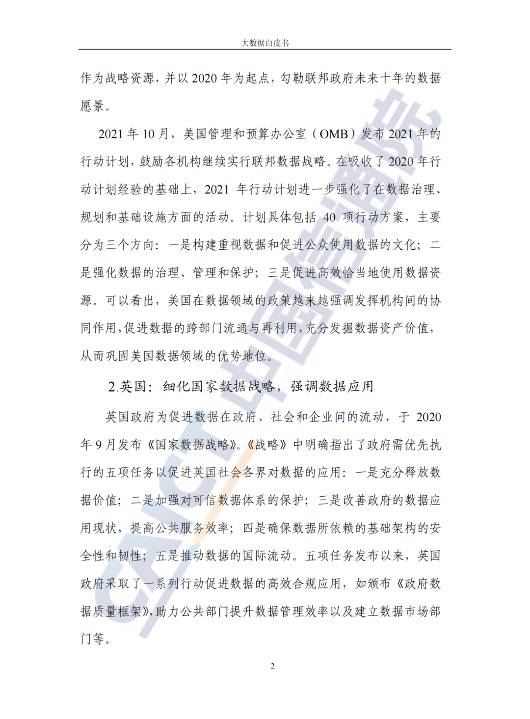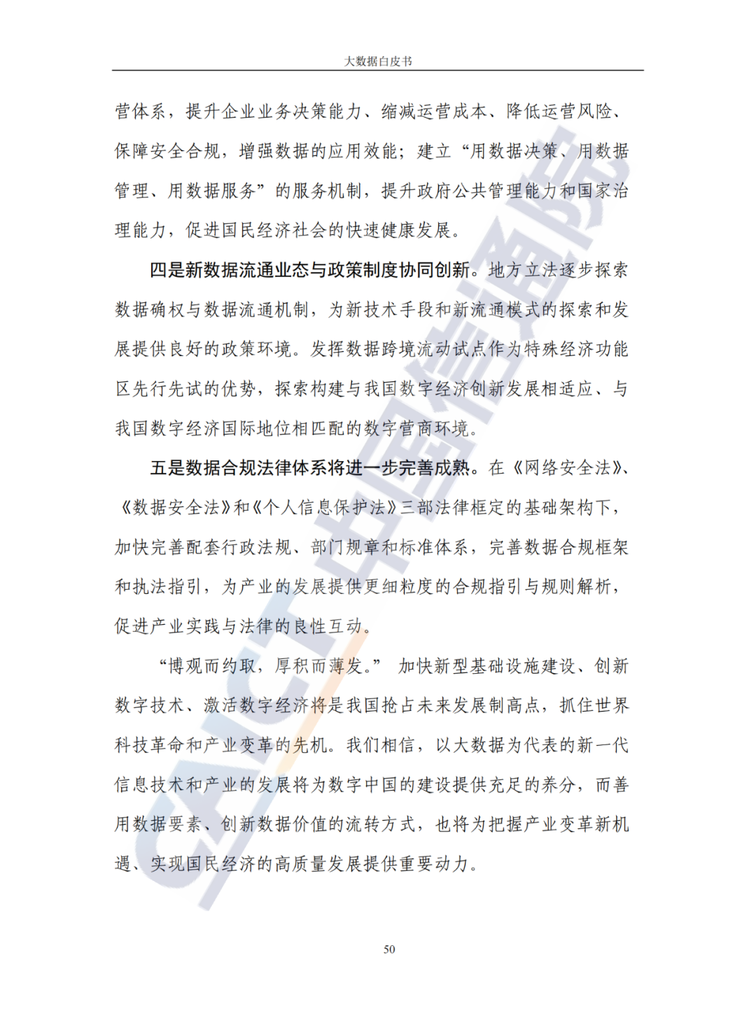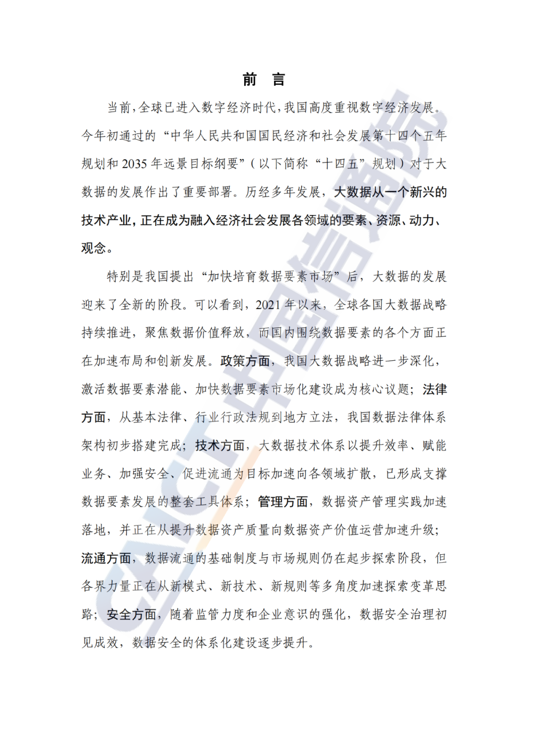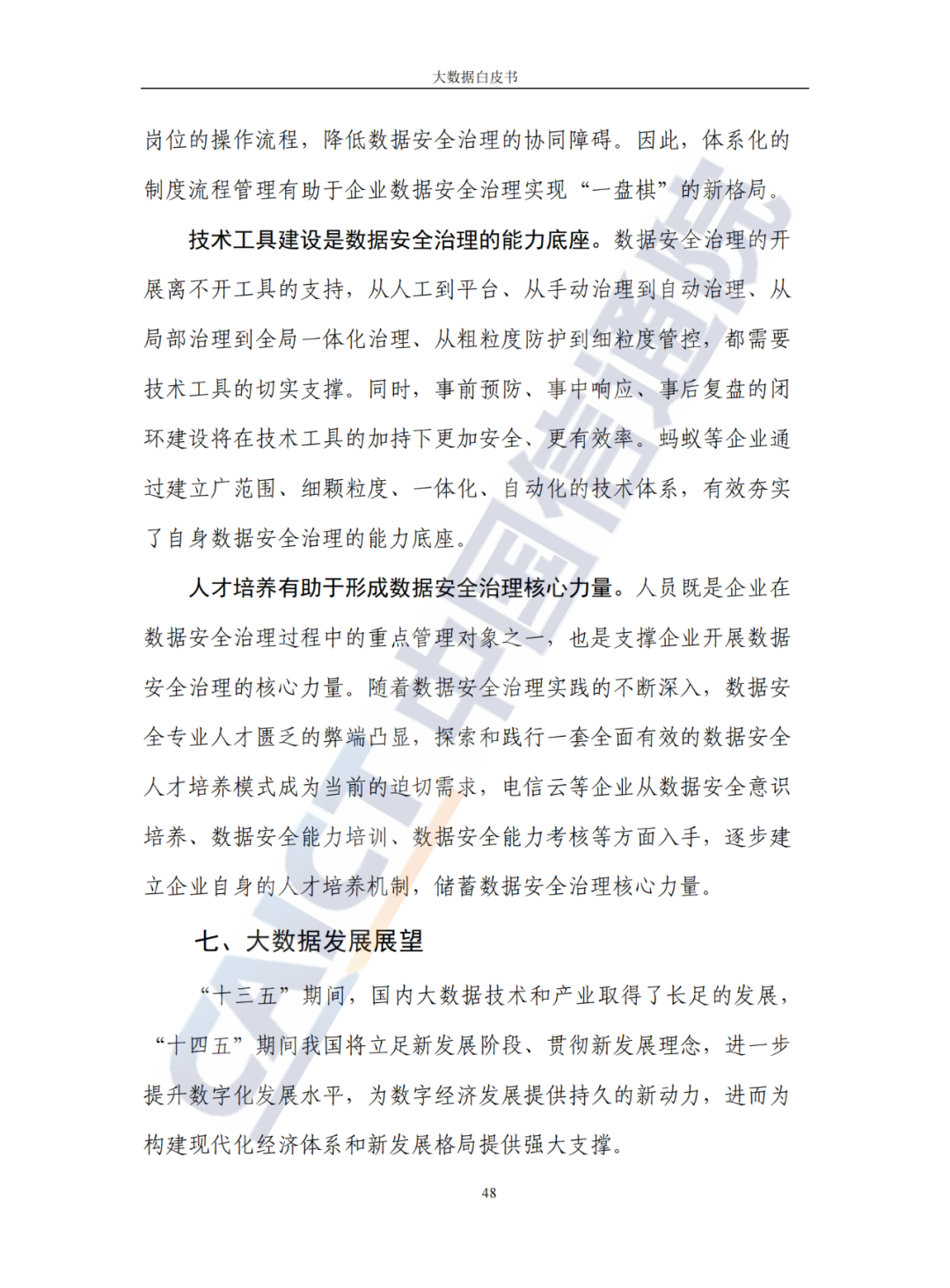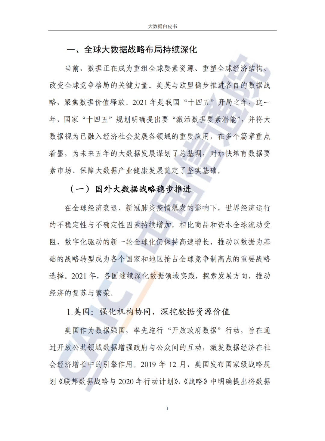 中国信息通信研究院发布的《大数据白皮书》以数据要素的价值释放作为可信逻辑,重点探索大数据政策、法律、技术、管理、流通、安全等方面的内容,并对“十四五”期间我国大数据的发展进行展望。