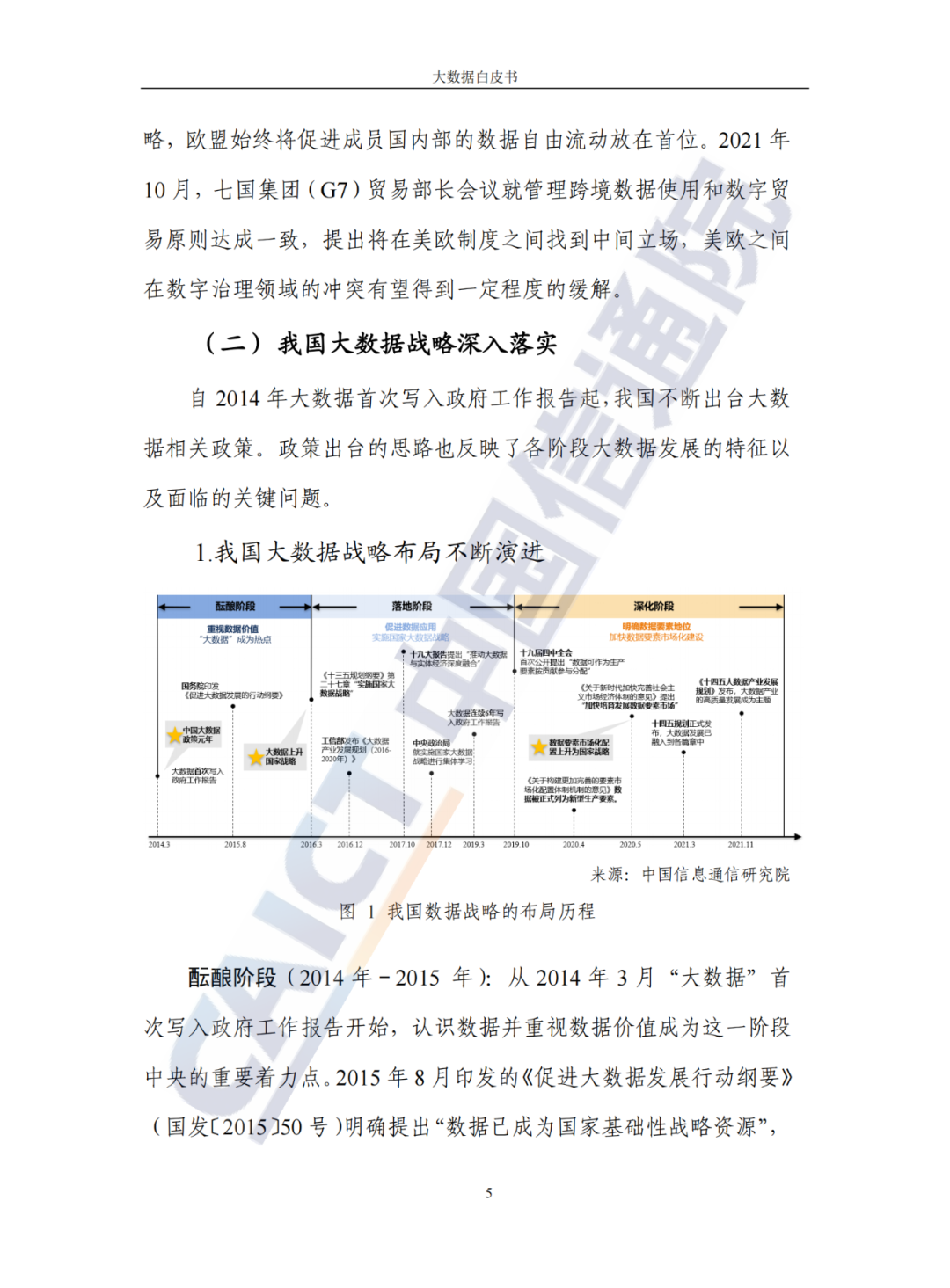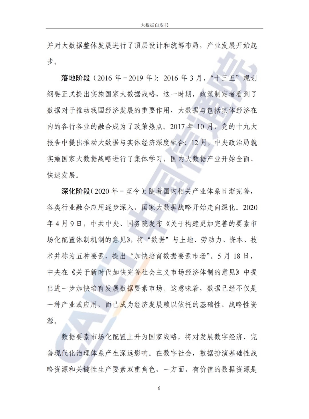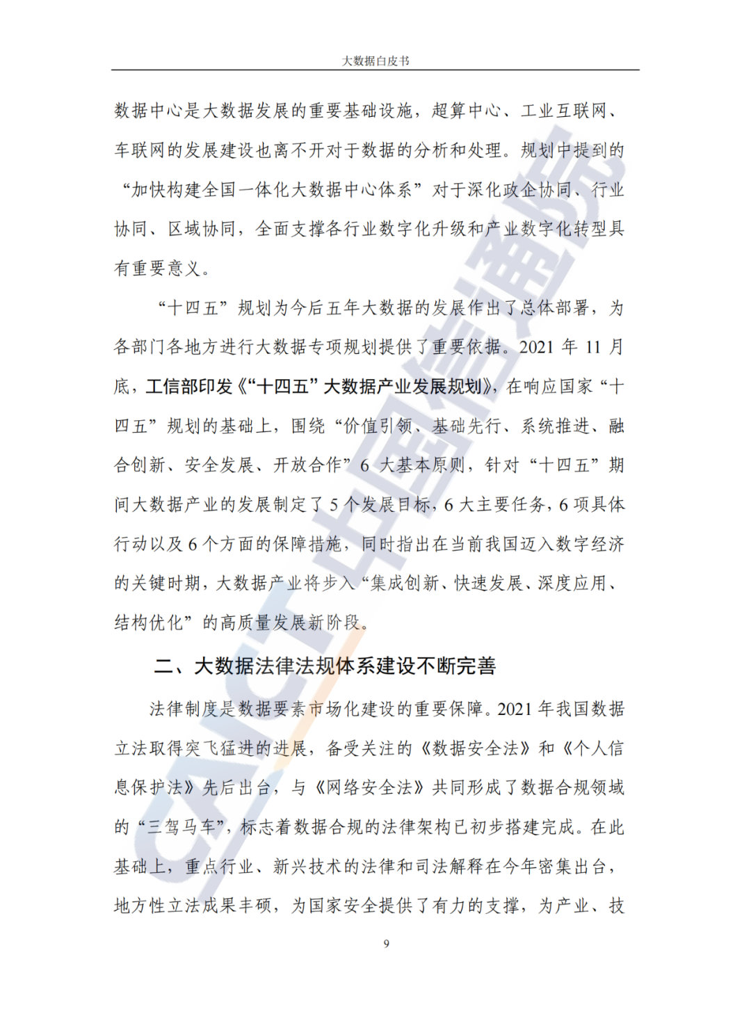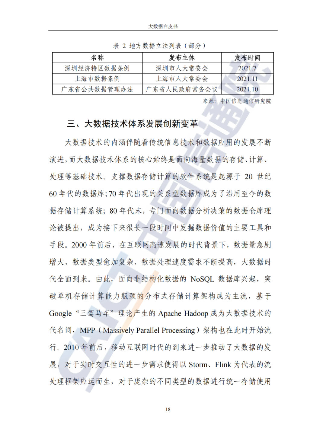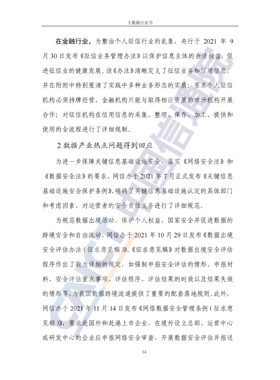 中国信息通信研究院发布的《大数据白皮书》以数据要素的价值释放作为可信逻辑,重点探索大数据政策、法律、技术、管理、流通、安全等方面的内容,并对“十四五”期间我国大数据的发展进行展望。