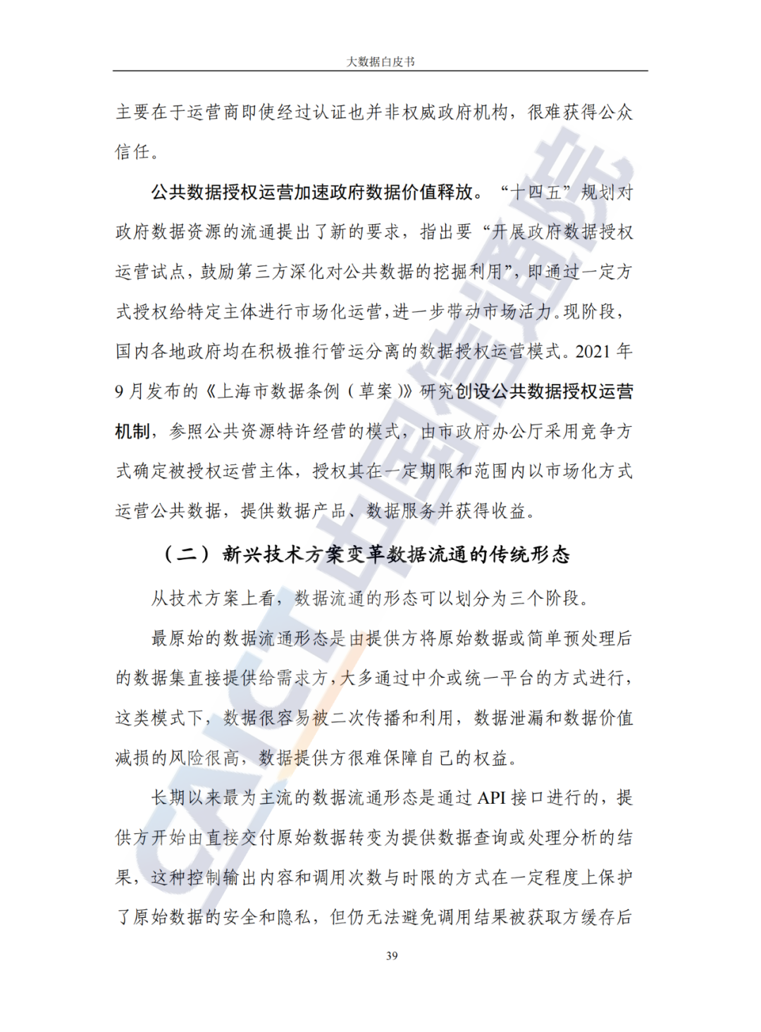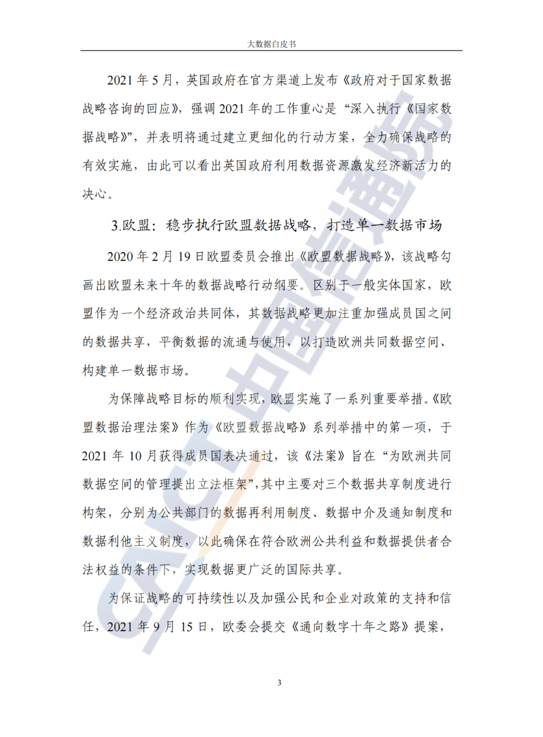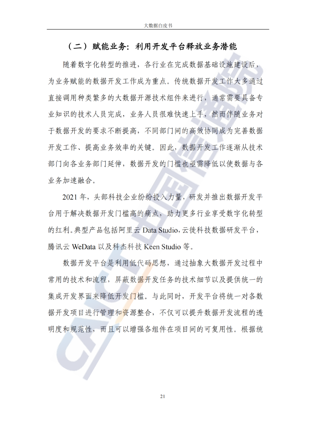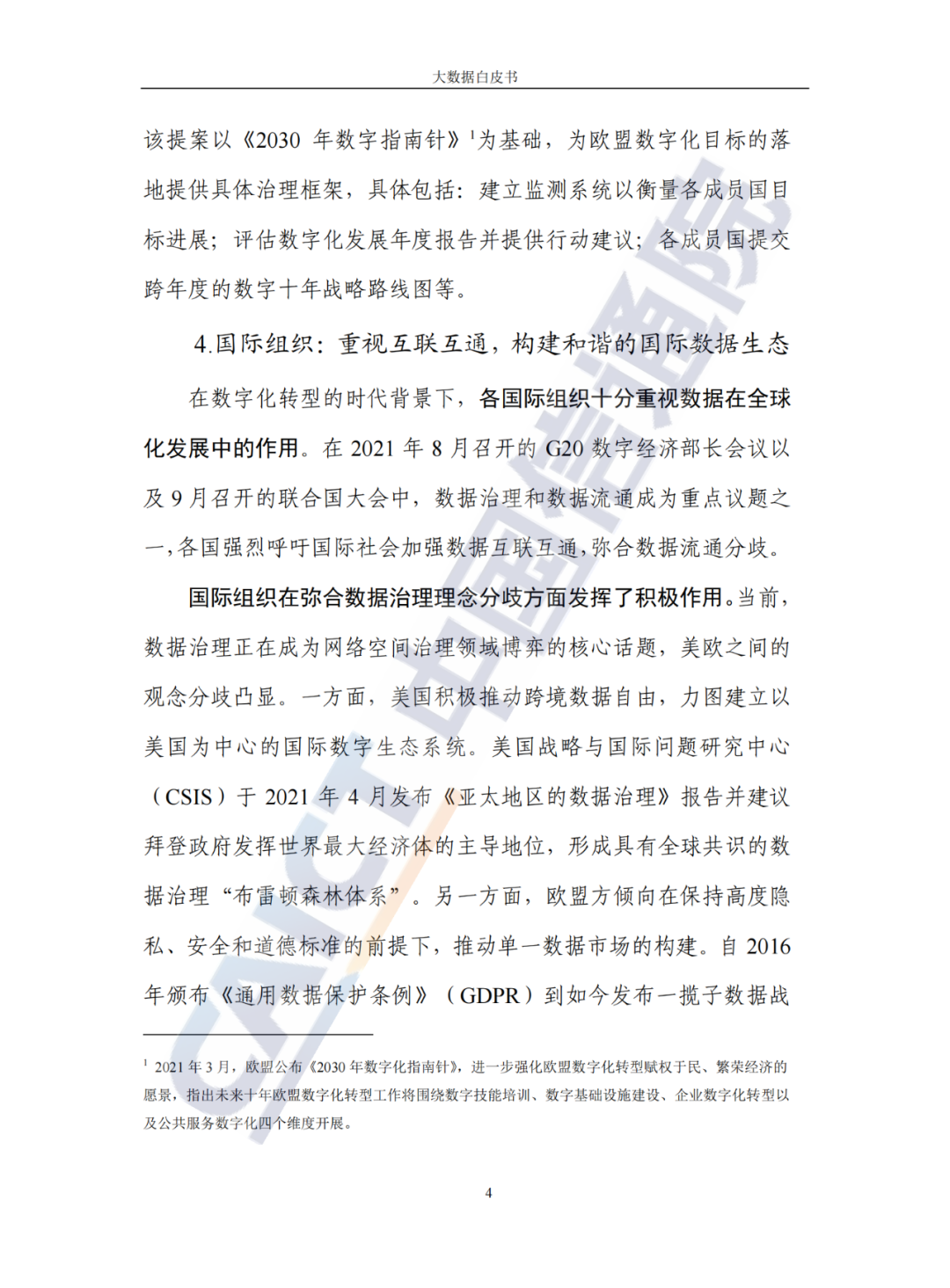 中国信息通信研究院发布的《大数据白皮书》以数据要素的价值释放作为可信逻辑,重点探索大数据政策、法律、技术、管理、流通、安全等方面的内容,并对“十四五”期间我国大数据的发展进行展望。