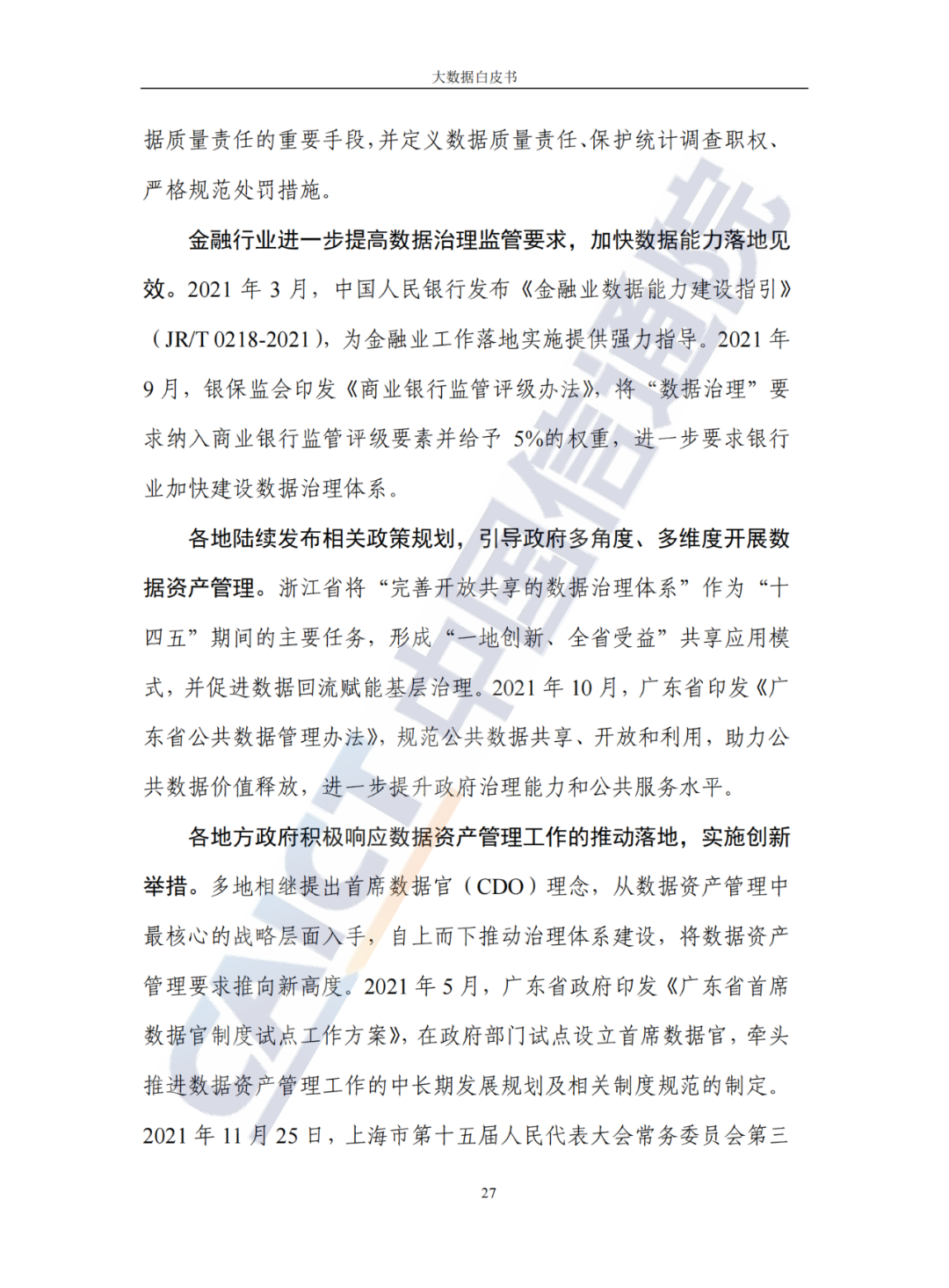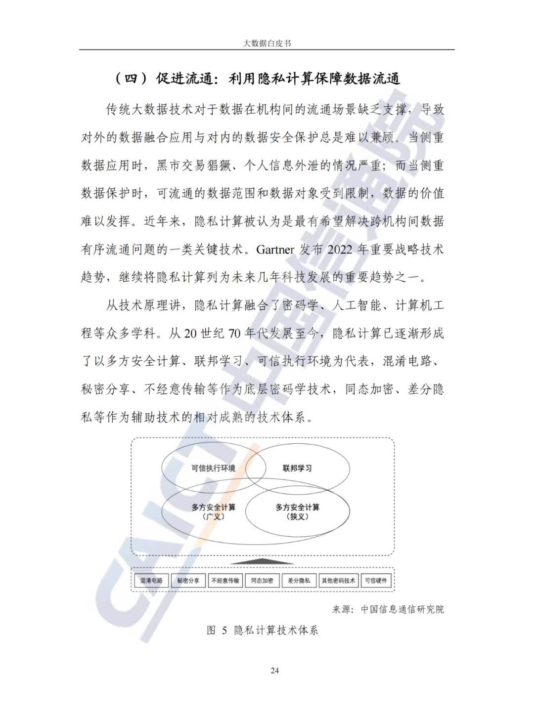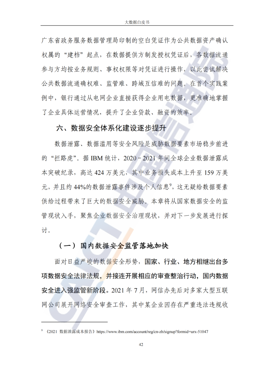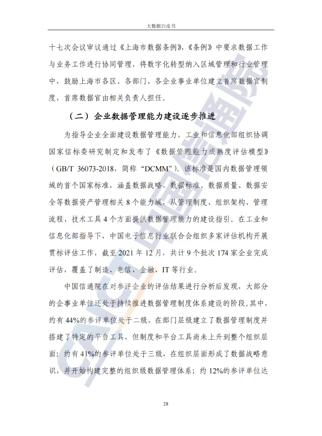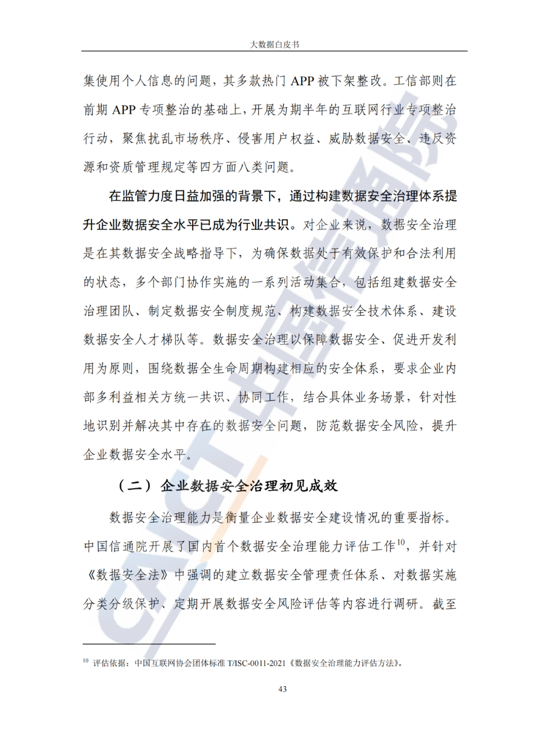 中国信息通信研究院发布的《大数据白皮书》以数据要素的价值释放作为可信逻辑,重点探索大数据政策、法律、技术、管理、流通、安全等方面的内容,并对“十四五”期间我国大数据的发展进行展望。