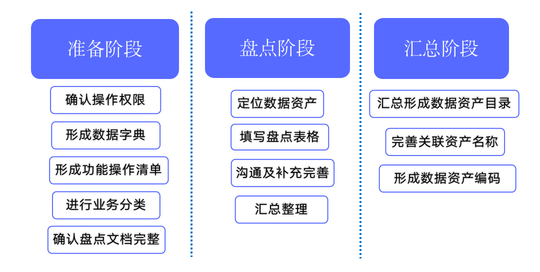 数据资产盘点工作,整体包括准备阶段、盘点阶段、汇总阶段三部分流程,其中盘点阶段根据所盘点系统的不同类型和特征,包含4个子流程、分别针对套装软件、自开发系统、分析系统、数据仓库开展盘点工作。