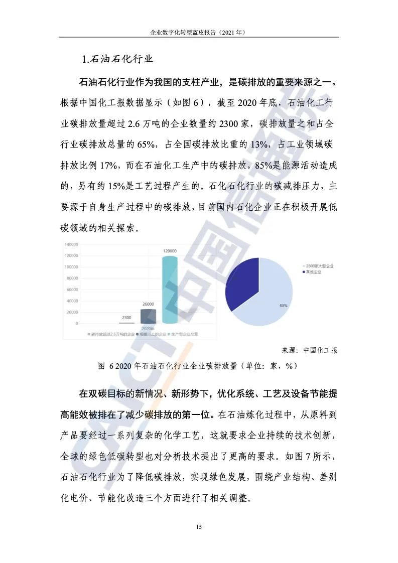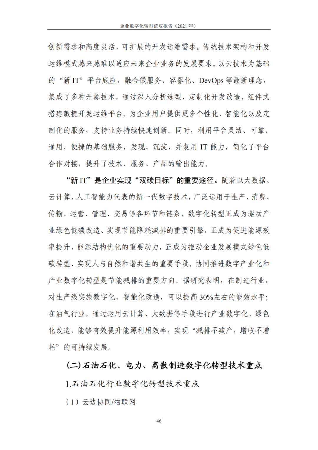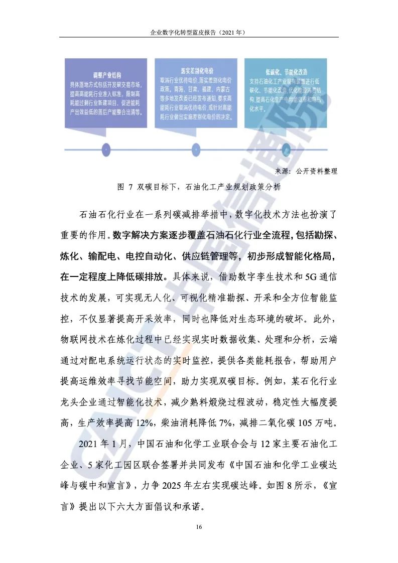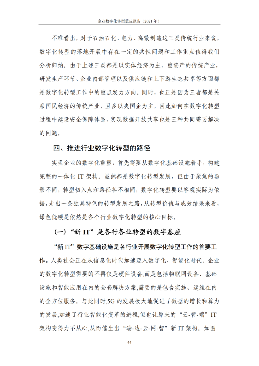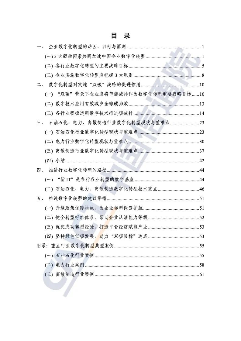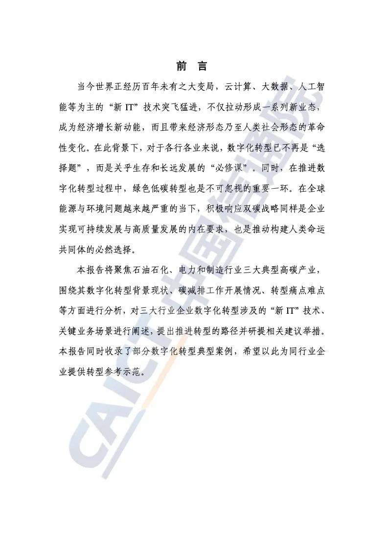 本报告聚焦石油石化、电力和制造行业三大典型高碳产业,围绕其数字化转型背景现状、碳减排工作开展情况、转型痛点难点等方面进行分析,对三大行业企业数字化转型涉及的“端-边-云-网-智”为代表的“新IT”技术、关键业务场景进行阐述,提出推进转型的路径并研提相关建议举措。本报告同时收录了部分数字化转型典型案例,希望以此为同行业企业提供转型参考示范。
