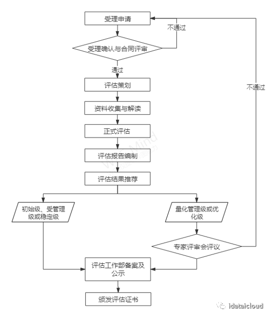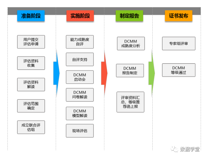 DCMM评估流程大致分为:受理申请(填写申请书)→合同受理(签订合同)→资料收集解读→现场评估→撰写评估报告→DCMM专家委员会审核→公示→颁布证书。整个流程因为等级申请在时间周期上有所差异,基本上在1~2个月时间,主要依据DCMM专家委员会审核周期来确定。(1)评估机构提供培训和咨询辅导,建立数据管理组织,完善制度,内部运行并开展自评估。(3)评估机构受理评估申请后,组织实施文件评审和现场评审并出具评估报告,给予评估等级的推荐意见,并报评估工作部备案。(4)评估工作部对评估机构报送的评估结果进行合规性审查。对于合规性审查中发现存在较大问题的评估结果有权驳回。对于评估机构推荐的量化管理级和优化级评估结论,评估工作部需组织专家对评估结果进行评议。(5)评估工作部对通过审查、复核或评议的,进行为期一周的公示。对公示后无异议的,由评估机构颁发数据管理能力成熟度评估证书。8. 企业目前制度标准还不够规范,如何能够获得比较高等级的证书?与其他的资质认证一样,企业可以选择通过贯标咨询来提升能力,但是由于整个DCMM工作开展时间不久,所以很多咨询机构只是在尝试性开展业务,评估能力良莠不齐,需要做好甄别。- Step2:能力建设:建立数据管理组织,完善制度,内部运行并开展自评估。