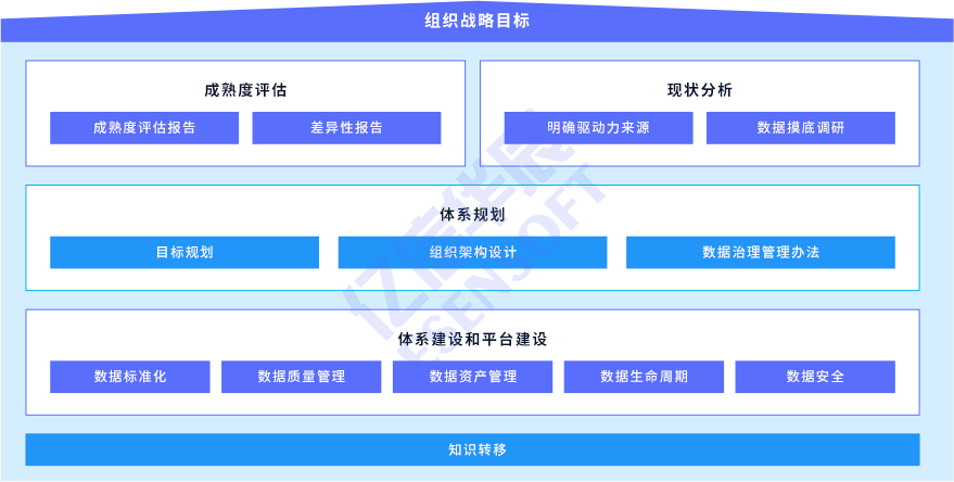 大数据治理解决方案主要通过数据治理工作提升数据的价值,为政府部门实现数字战略夯实基础。其中数据治理工作作为一个管理体系,包括组织、制度、流程、工具,全方位保障数据,改善数据决策,提升数据可信,防范数据风险。