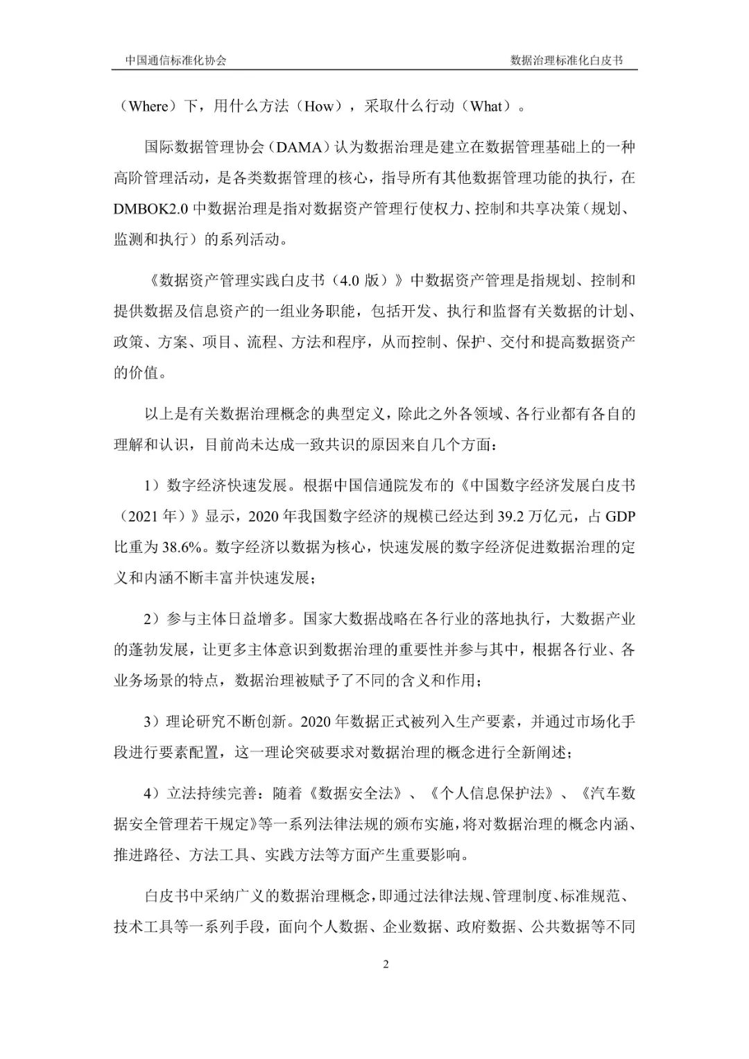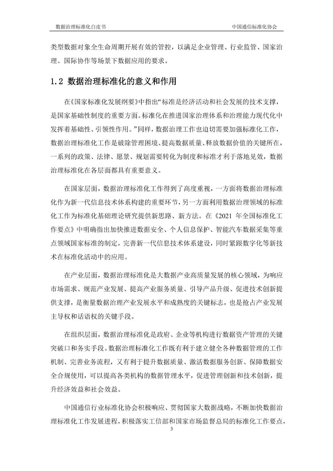 《国家标准化发展纲要》中明确指出,标准是经济活动和社会发展的技术支撑,标准化在推进国家治理体系和治理能力现代化中发挥着基础性、引领性作用。同样,数据治理标准化在国家、产业、组织层面也具有重要意义,数据治理与标准化的结合构成了国家现代化发展进程的基础,也是推进各类机构管理创新、技术创新,提升经济、社会效益的突破口。