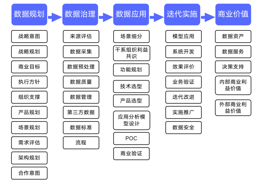 根据以往项目经验,一个大数据项目的落地,可以大致总结为五大步骤阶段:数据规划、数据治理、数据应用、迭代实施、商业价值,如下图所示。
