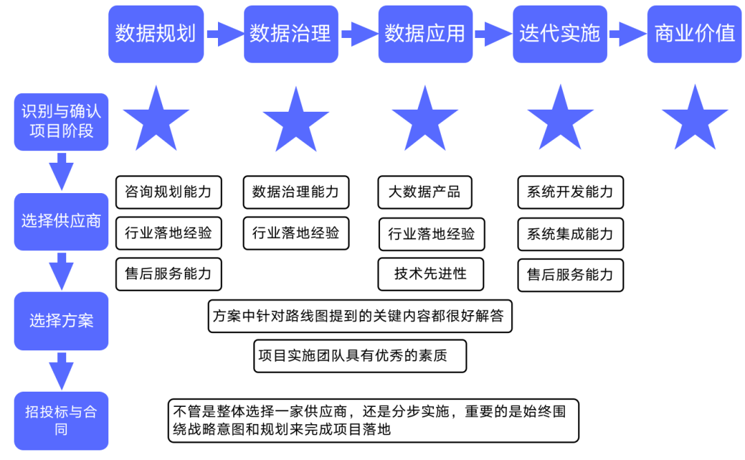 一般来说,建议后面三个阶段最好选择一家有综合能力的供应商来总包实施,这样可以更好完成项目的预期目标。