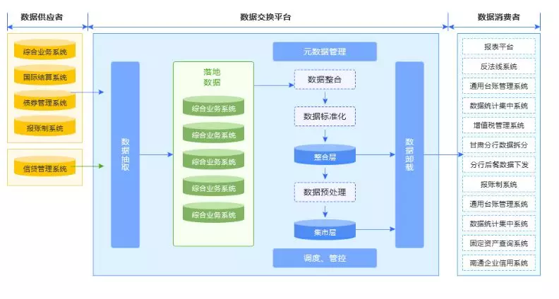 针对综合业务系统、信贷、国际结算等源业务系统的数据通过亿信数据交换平台进行统一抽取,通过数据转义、码值转换等实现数据标准化,并将处理后的数据以文件或库表等形式下发给消费系统。