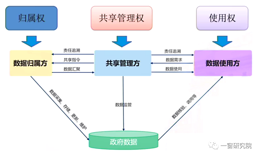 既然这样,在当前我们推进政府数字化转型和数字化建设过程中,该怎么去思考这些问题?首先,要对政府部门在政务数据的管理和使用中要进行确权,各个部门该承担什么样的权责,需要进行明晰。如下图,我们通常说数据共享使用涉及到三个方面:①数据的拥有方或叫归属方;②数据的使用方;③对数据平台行使管理职能的管理方。——指存储、掌握政务数据资源,可对数据内容进行定义、解释的权利;掌握数据归属权的部门一般应承担政务数据的收集、整理、维护、更新等工作,对数据资源的完整性、数据质量、数据标准负责,并可以根据自身需要优先使用、支配数据资源。各地各部门在使用政务数据的过程中,应根据业务需求的实际情况,按照最低限度申请使用的权限,要明确使用方式,并遵守相应的权限要求,在规定的范围和界限内来使用政务数据资源,不能随意它用或乱用。在政务数据资源的共享使用中,应由拥有共享管理权的部门,充当调度、协调、仲裁的角色,对数据共享中出现的争议和问题进行处置和裁决,对不按照规则存储、维护和使用数据的部门进行责任追溯;数据共享过程中的共享管理权,可拥有数据归属权的部门掌握,也可以由不拥有数据归属权或使用权的第三方部门掌握(如政务资源中心、大数据管理局等)。