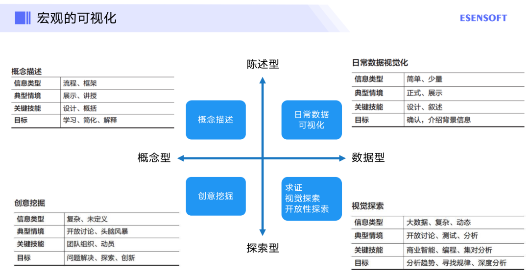 象限二是概念性的描述,也就是类似于组织结构图、决策树就是电典型的概念描述图表;象限三是创意挖掘,比如战略讨论和创意项目早期阶段所画的图等;而象限一与四,也就是我们微观层面上的数据可视化,也是本次直播给大家分享的。