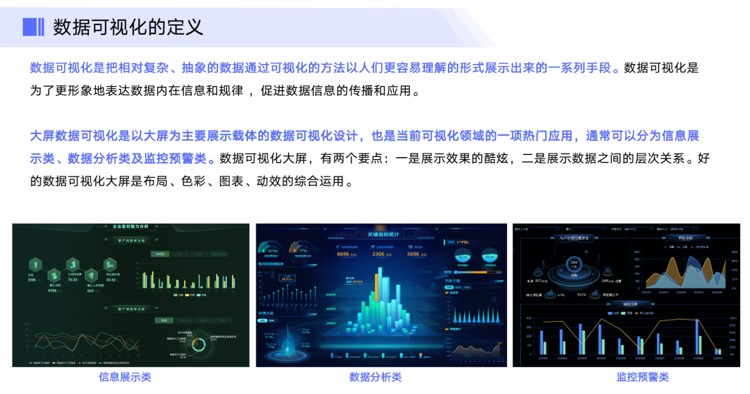 而我们本次直播所分享的大屏数据可视化,是以大屏为主要展示载体的数据可视化设计,也是当前可视化领域的一项热门应用,通常可以分为如图所示的信息展示类、数据分析类及监控预警类。