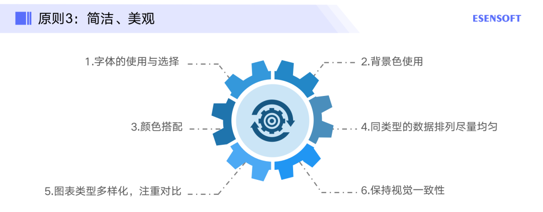 但这里我们也需要注意的是数据可视化是一种信息交流形式,它以图形形式描绘密集和复杂的信息,最终的视觉效果旨在简化数据,并使用数据帮助用户决策。因此总体上需要遵循三个小原则;