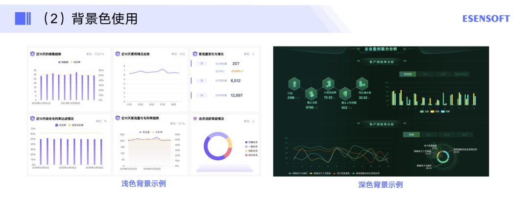 颜色是可视化大屏中影响画面效果的重要元素。使用不当,会让读者分心。背景色的选择与可视化展示的设备相关,分为深色、浅色、彩色。