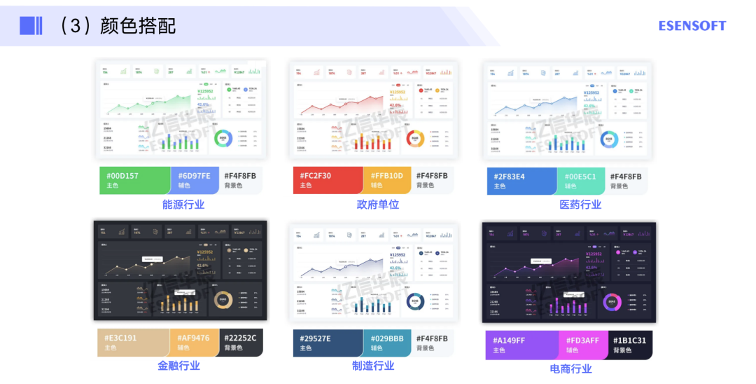 这里需要注意的是色彩的饱和度和明度,它们需要差异显著、对比鲜明,尽量避免使用邻近色配色。如果颜色过于相似(例如浅灰与更浅的灰),人们难以发现两者间的区别。相反,也要避免强烈的对比色,例如红配绿或蓝配黄。这里亿信华辰曾为多个行业配置过可视化大屏,列举一些各个行业的专属的一些配色,大家可以参考下。