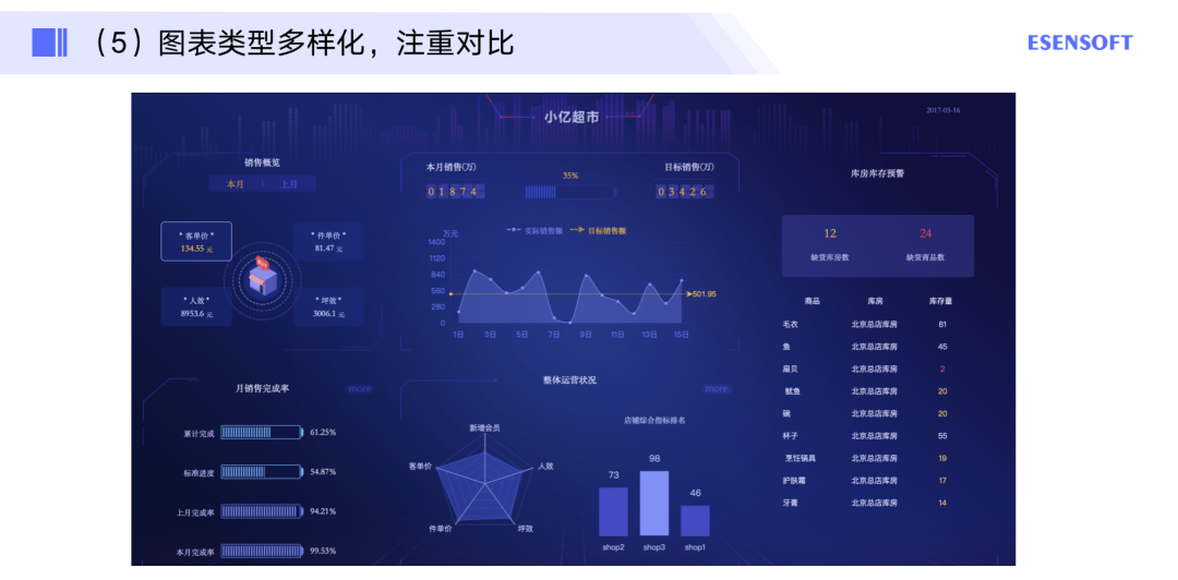 (1)易理解:可视化设计要考虑大屏最终用户,可视化结果应该是一看就懂,不需要思考和过度理解,因而选定图表时要理性,避免为了视觉上的效果而选择一些对用户不太友好的图形。