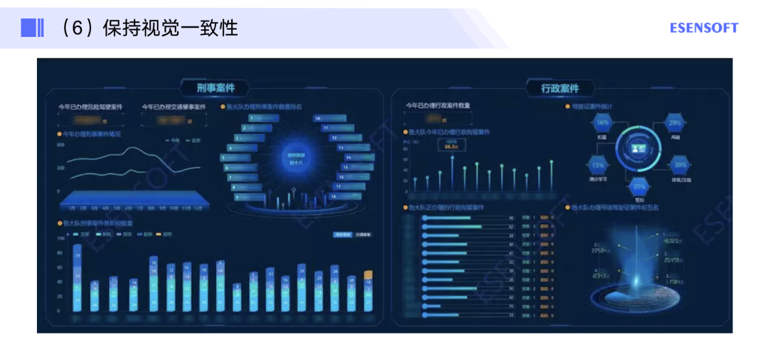不要一会黑白配,一会又来个红绿配。图表、图像、按钮包括尺寸,都要与整体风格保持一致。要么都是填充式的,要么都是中空式的,要么都是棱角分明,要么都是圆润光滑。例如下图,某公安行业可视化大屏(部分)是个很好的例子,配色统一,风格一致。