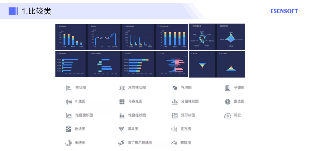 可视化的方法显示值与值之间的不同和相似之处。使用图形的长度、宽度、位置、面积和颜色来比较数值的大小,通常用于展示不同步分类间的数值对比,不同时间点的数据对比。因此关于比较类的图表,我们可以有多种图表进行选择,比如柱状图、气泡图、雷达图等等。