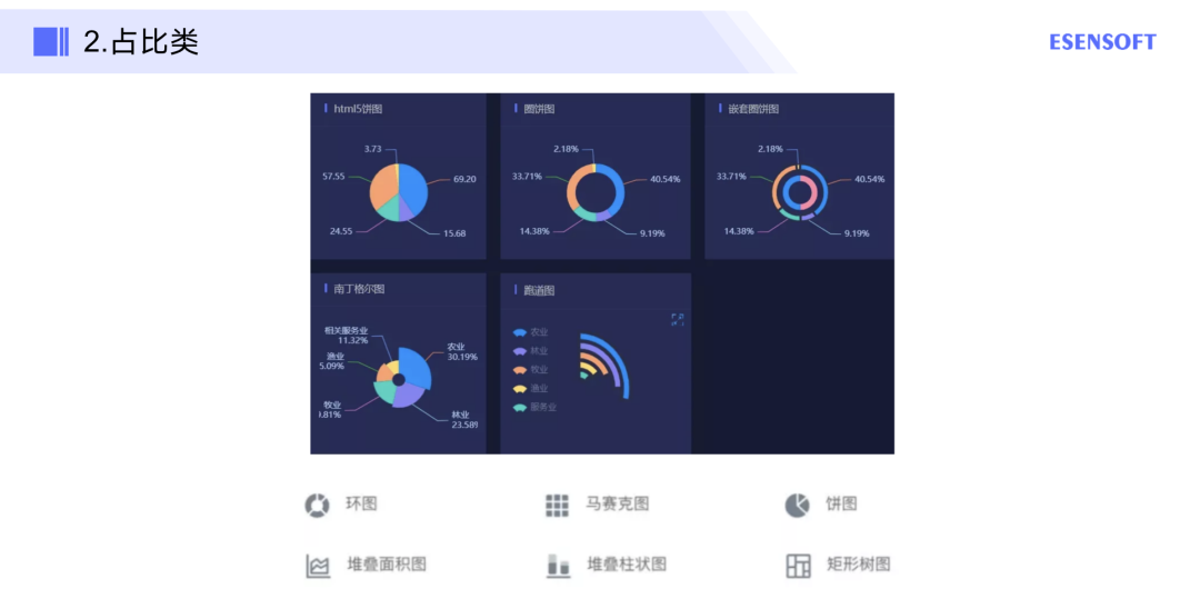 可视化的方法显示同一维度上占比关系,可以使用饼图、环图、矩形树图等等。