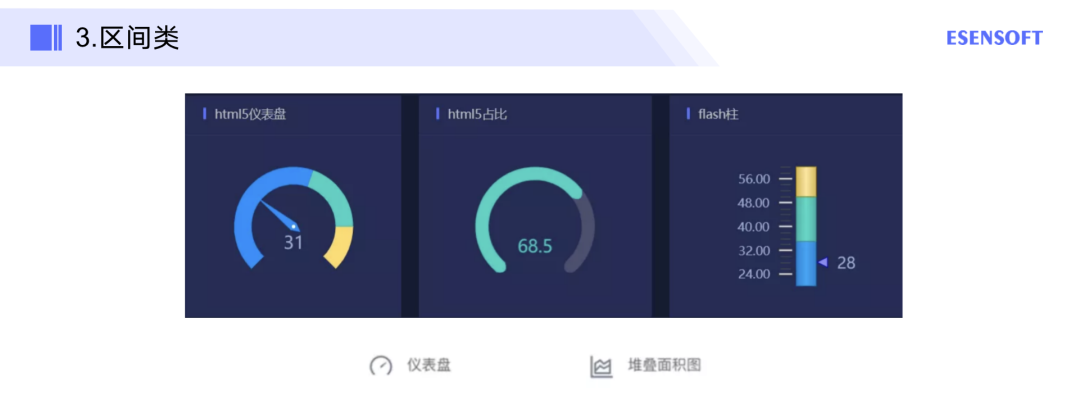 可视化的方法显示同一维度上值的上限和下限之间的差异。使用图形的大小和位置表示数值的上限和下限,通常用于表示数据在某一个分类(时间点)上 的最大值和最小值。比如仪表盘、堆叠面积图等。