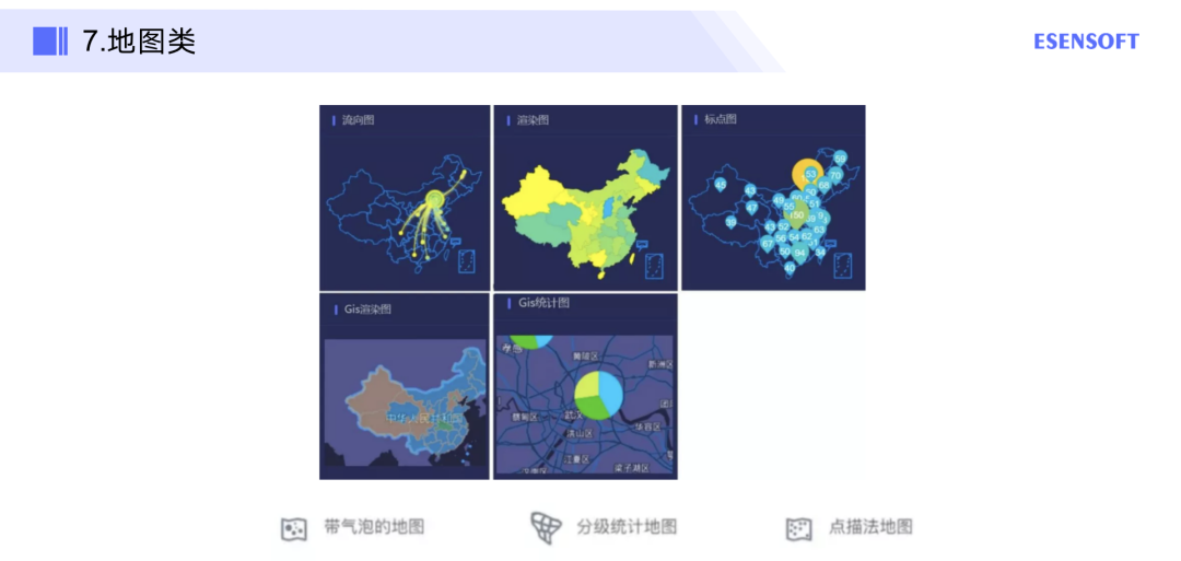 这个是现在政务大屏上出现最多的统计图,主要分为两类,一类是传统的热区地图,一类是我们的GIS地图,通过显示地理区域上的数据,使用地图作为背景,通过图形的位置来表现数据的地理位置,通常来展示数据在不同地理区域上的分布情况。GIS地图还可以通过定位、放大缩小的特性来展示咱们的事件或者事务对象的真实情况。